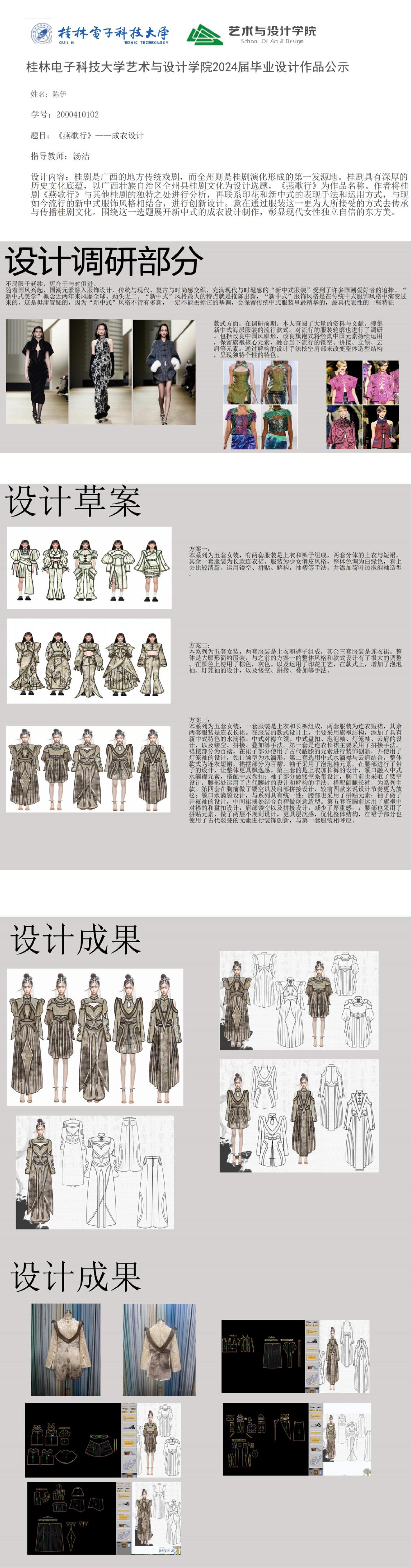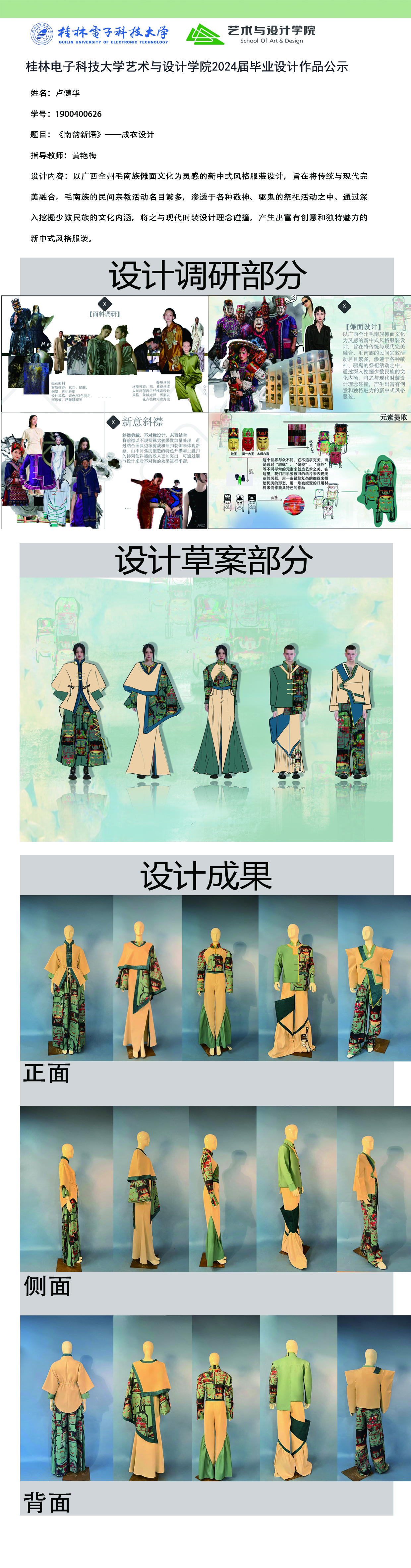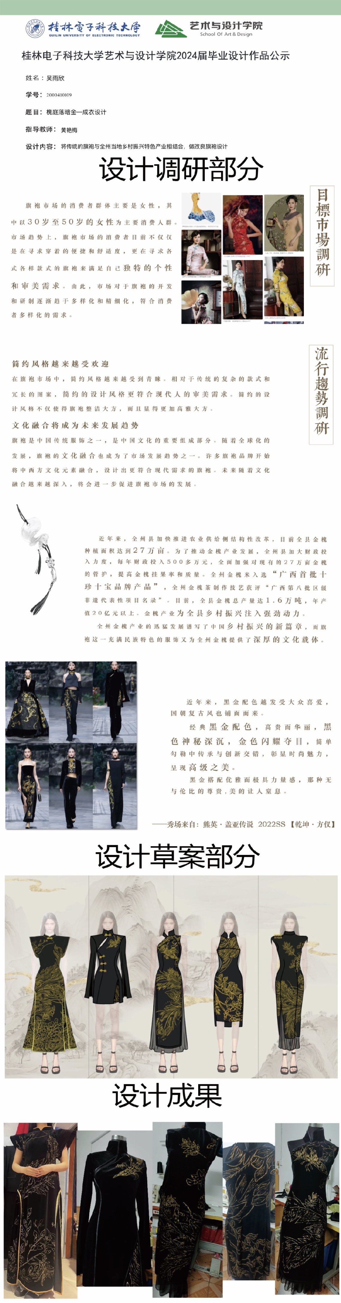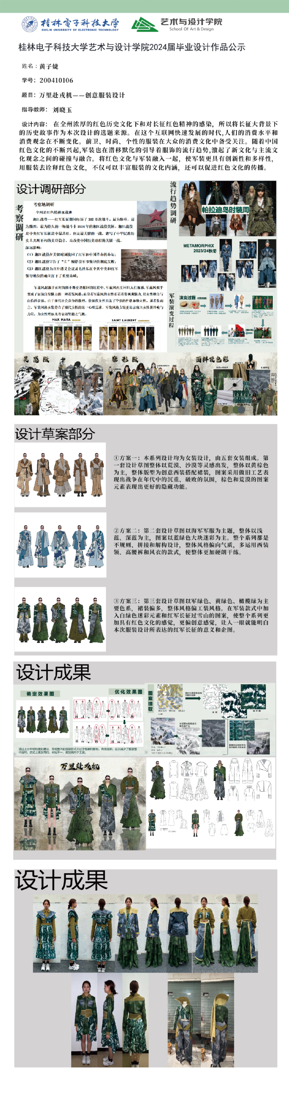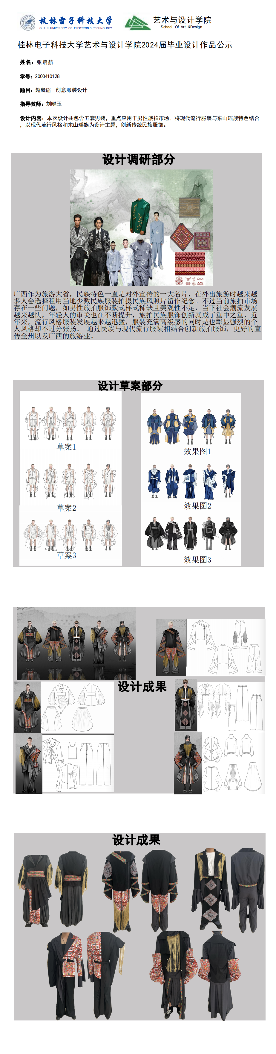 根据毕业设计管理文件规定,现将2024届服装与服饰计专业毕业设计作品进行公示。对所公示的作品如有疑议,请实名举证。公示期为三天(2024.04.25-2024.04.27)。作品公示期间的意见反馈邮箱:452660258@qq.com,联系电话:18593281965。