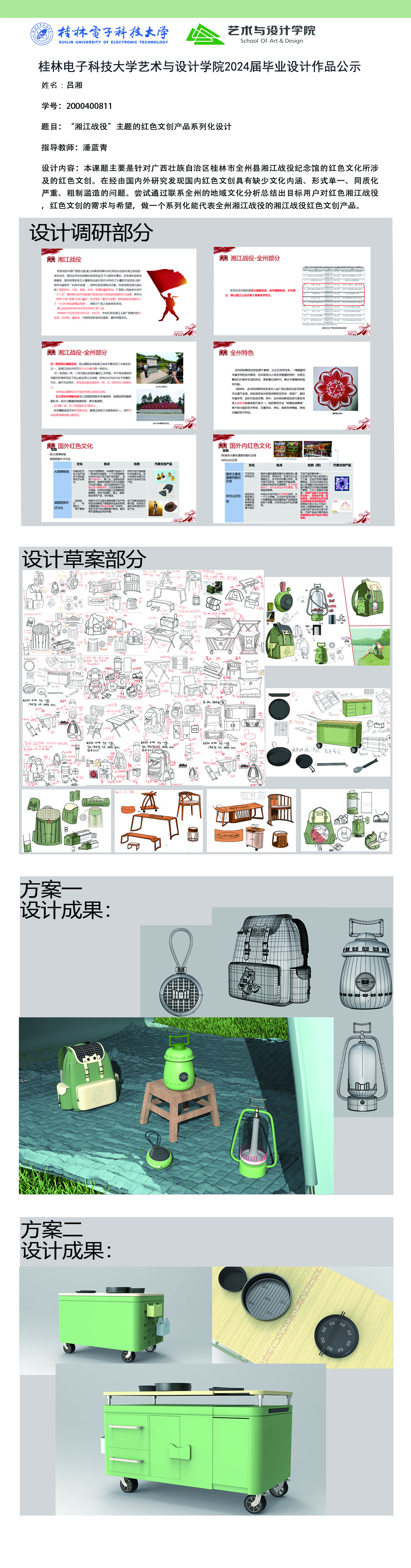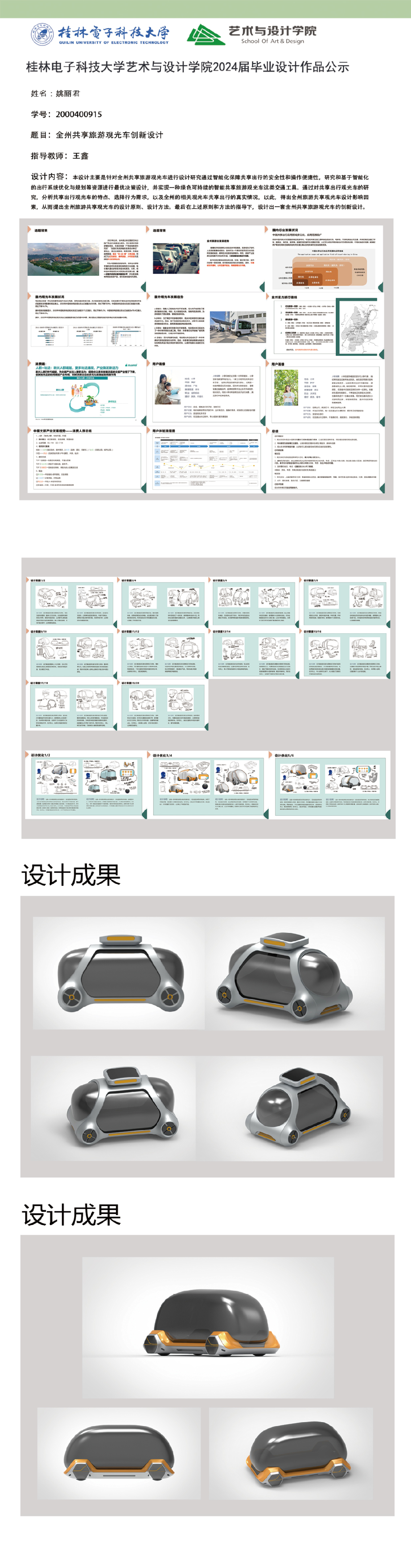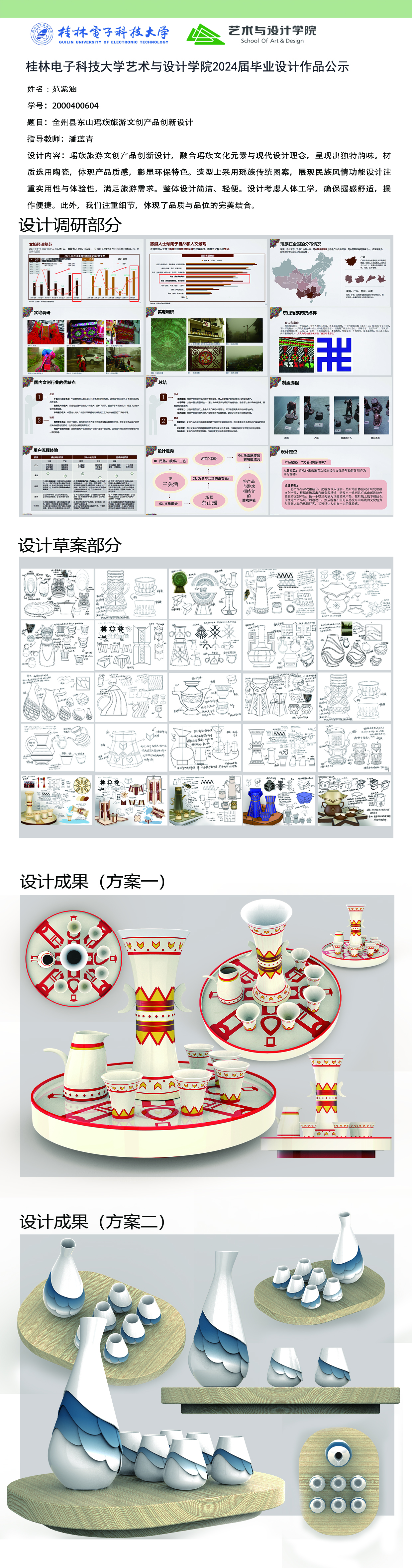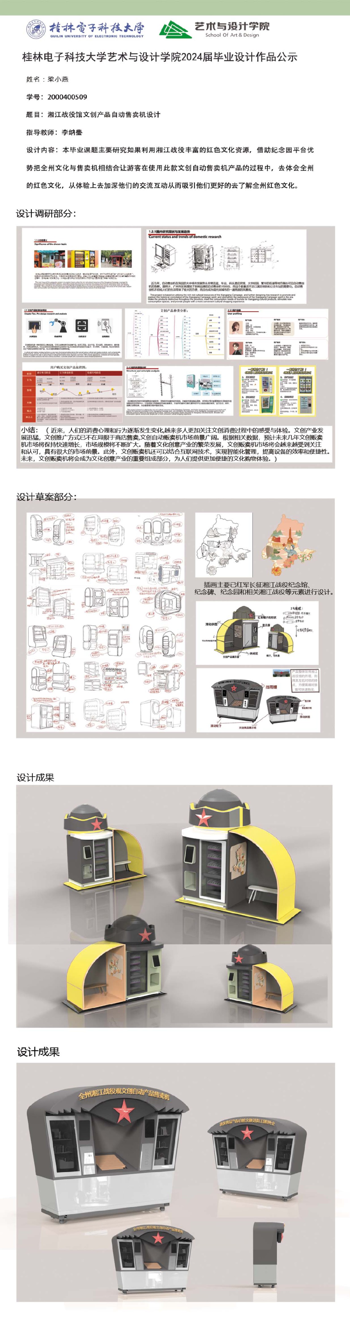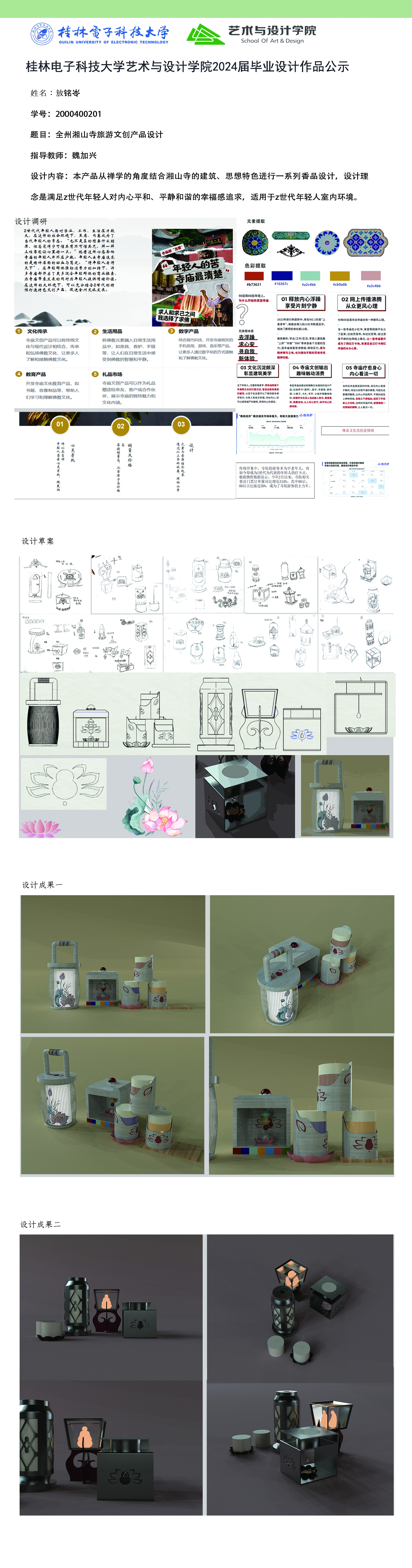 根据毕业设计管理文件规定,现将2024届产品设计专业毕业设计作品进行公示。对所公示的作品如有疑议,请实名举证。公示期为三天(2024.04.25-2024.04.27)。作品公示期间的意见反馈邮箱:360758122@qq.com,联系电话:18978660487。