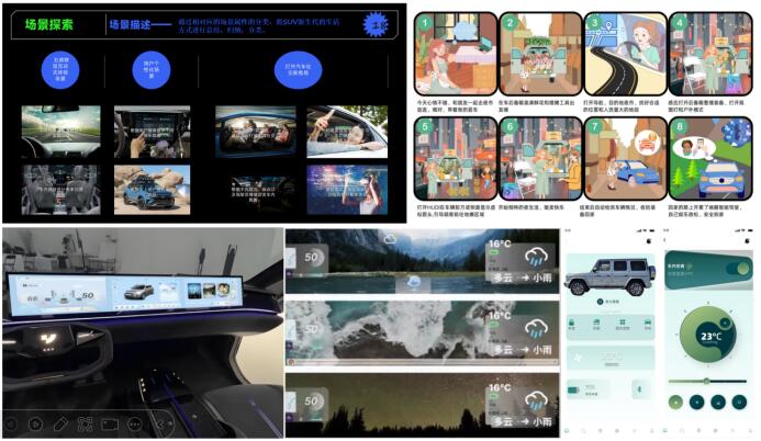 在对智能汽车的体验和能力架构有了深入理解之后,各小组首先从车型定义、用户定义、场景定义三个维度收集和分析信息,初步明确了越野车和SUV两种车型的目标用户及其差异。然后,各小组再对竞品车型的HMI体验进行了分析,包括中控和仪表盘的主框架布局以及功能内容,以寻找设计上的差异和创新点。经过多轮的共创和优化,七个小组最终提出了包括“登界游方”、“高品质City Drive”、“音乐社交”、“情绪秘境”、“征途行者”、“自由予愉”和“驰野途趣”在内的一系列新体验概念,并将这些概念以预期的方式呈现在了工作坊的设计成果中。