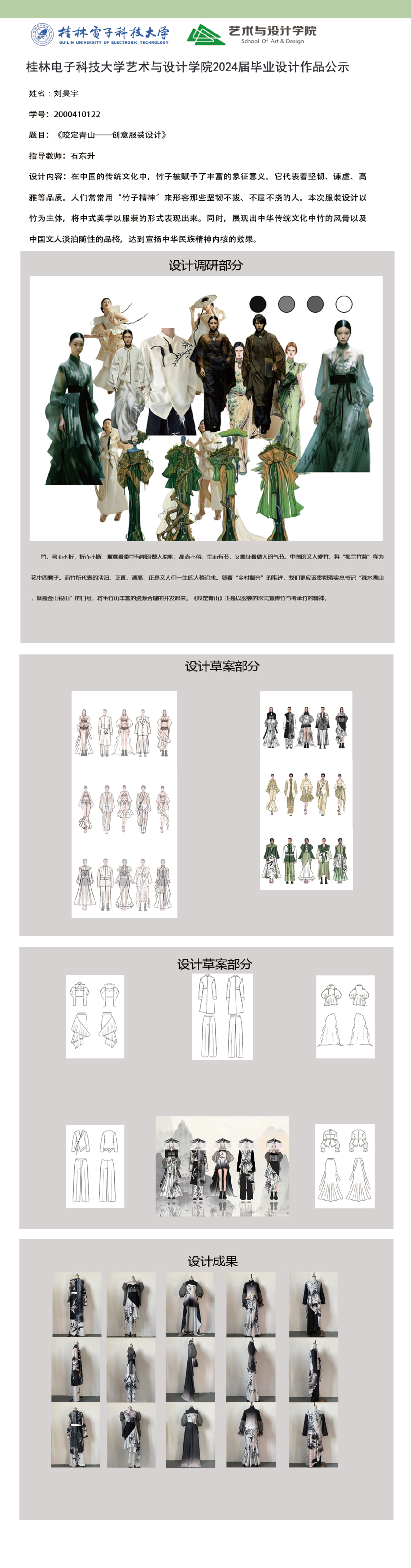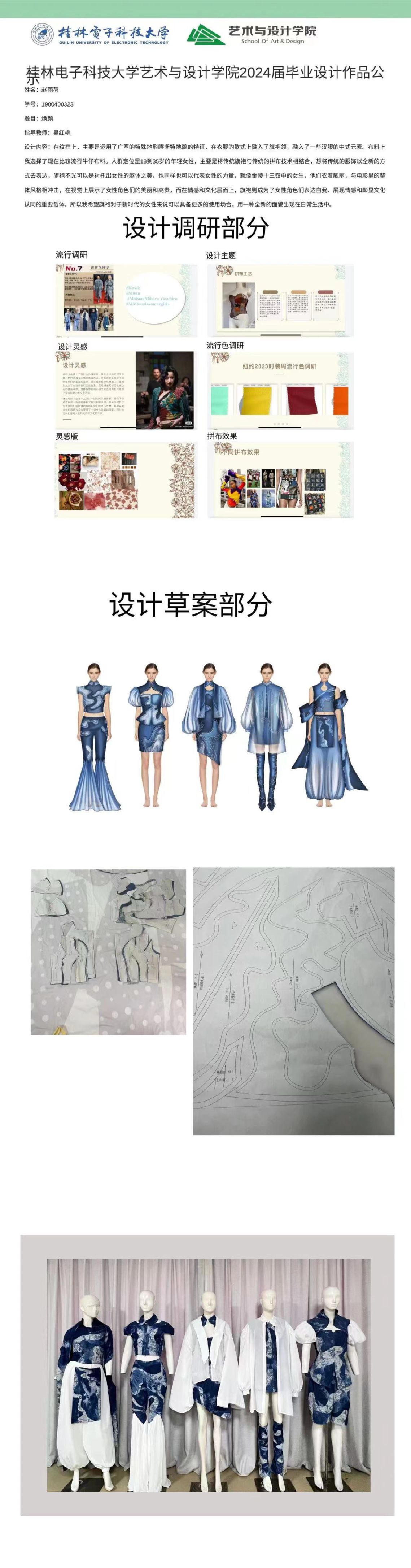 根据毕业设计管理文件规定,现将2024届服装与服饰设计专业毕业设计公示作品(二)进行公示。公示期为三天(2024.05.20-2024.05.22)。对公示的更正作品如有疑议,请实名举证。意见反馈邮箱:452660258@qq.com,联系电话:18593281965。