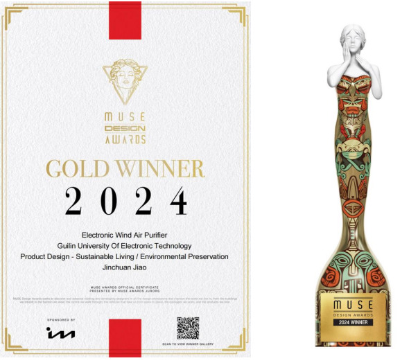 近日,全球设计领域具有影响力的国际奖项之一的美国MUSE Design Awards(缪斯设计奖)2024年度获奖名单正式公布,我院产品设计专业教师焦金川独立设计的“Electronic Wind Air Purifier”(电子风空气净化器)从众多国内外优秀作品中脱颖而出,荣获金奖。