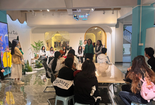 在马红老师的带领下,学生们认真听取企业阳经理创业之路的经验分享,分析从学校到社会应该具备的专业能力及综合素质。接着参观了企业的订货会展示厅、服装工厂的设计部门,详细了解了设计师如何将创意转化为实际可生产的服装款式。随后,大家走进生产车间,目睹了从面料选择、裁剪、缝制到最终成品的每一个环节。工厂的技术工人还向学生们展示了服装CAD制图及输出、电脑激光裁台等多种先进的缝纫技术和设备,让学生们对现代服装制造业有了更直观的认识。