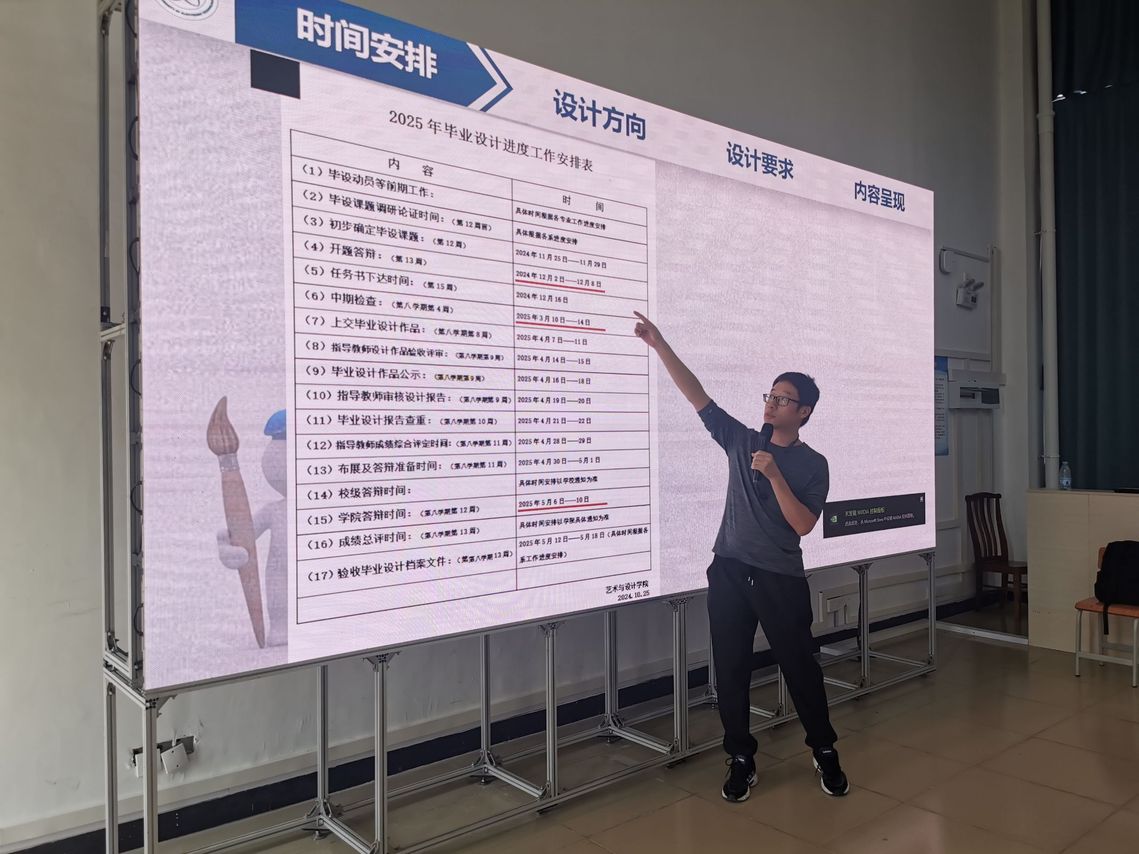 动员会上,赵勤恒介绍了毕业设计的时间节点和选题方向,并强调了本届毕业设计不仅包括作品创作、手册撰写和展板设计等内容,还新增了涉及AI创作及周边产品开发等方面的考核标准。