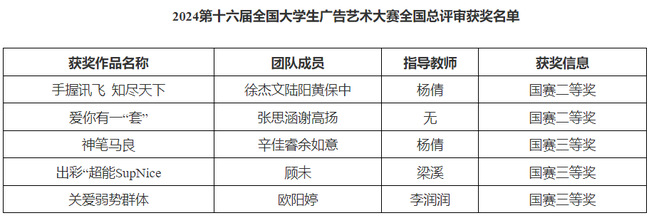 近日,第16届全国大学生广告大赛总评审名单正式揭晓,广告大赛成果展示盛典暨颁奖典礼在北京隆重举行。我校艺术与设计学院共斩获二等奖2项,三等奖3项,为学校争得了荣誉。