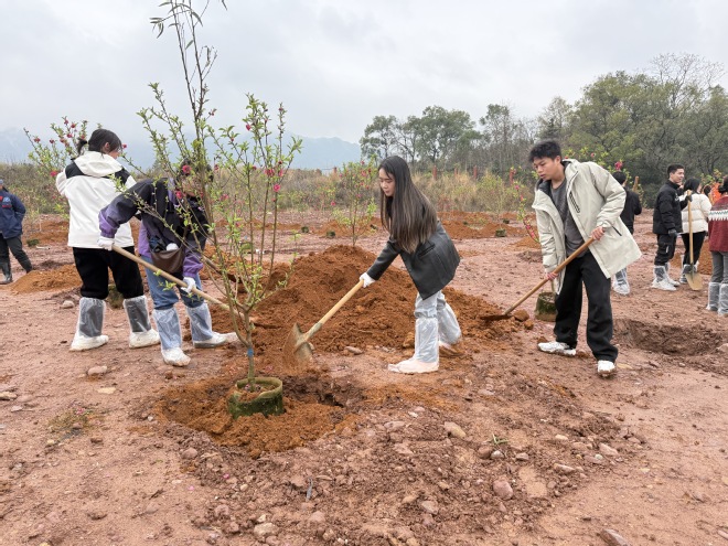 活动当天,学院院长叶德辉、党委副书记管鹏和师生代表齐聚校园内的五期B地块植树区域。大家手持铁锹、水桶等工具,热情高涨地投入到植树活动中。活动现场,大家分工明确、配合默契,有的负责扶苗,有的负责填土,每一个环节都一丝不苟。经过大家的共同努力,一株株树苗在校园内“安家落户”,为校园带来了新的生机与活力。