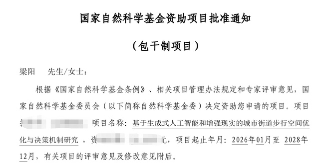 近日,2025年度国家自然科学基金项目评审结果公布。艺术与设计学院青年教师梁阳申报的项目《基于生成式人工智能和增强现实的城市街道步行空间优化与决策机制研究》成功获批为国家自然科学基金青年科学基金(C类资助)。该项目着眼于当前城市步行空间设计中的核心问题,结合生成式人工智能(GAI)与增强现实(AR)技术,创新性地提出了一种基于数据驱动、智能优化、公众参与和动态迭代的步行空间优化新范式。