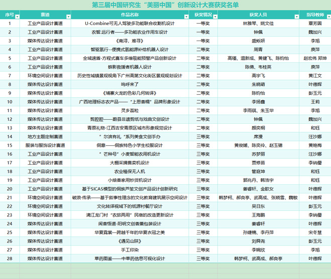 近日,由教育部学位管理与研究生教育司指导,中国学位与研究生教育学会主办,全国设计专业学位研究生教育指导委员会、全国风景园林专业学位研究生教育指导委员会担任学术指导的第三届中国研究生“美丽中国”创新设计大赛在黑龙江大学圆满落幕。学院研究生参赛作品表现优异,共斩获国家级奖项28项,包括一等奖3项、二等奖10项、三等奖15项,不仅实现了一等奖“零的突破”,也刷新了我校在该项赛事中的历史最佳成绩。同时,学院荣获“优秀组织单位”奖,艺术设计学院教师覃芳圆、魏加兴和李旭荣获“优秀指导教师”称号。