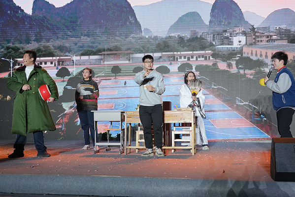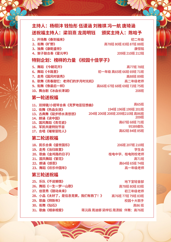 一场充满艺术气息的视听盛宴在校园内华丽上演,桂电中学、桂电附属学校学子们以满腔热情与活力点亮了舞台。晚会内容丰富、精彩纷呈,涵盖了现代舞、古典舞、器乐合奏、朗诵、小品、合唱等多种艺术形式,共31个精彩节目。有曲调优雅的民乐合奏《盛世国乐》、节奏欢快的器乐演奏《霍元甲》《克罗地亚狂想曲》;国风浓烈的舞蹈《碇步桥水清悠悠》《青花瓷》《繁花》;青春激昂的朗诵《读中国》《感恩》和乐队演唱《不说懒惰》;幽默的小品《太好了,是信息竞赛,我们有救了!》;热情洋溢的舞蹈《热血女孩》《旷野》和歌舞《春到福来》《今朝花开》等;有历史舞台剧《冰血长津湖》,更有老师们带来的节目《青春甜忆:老师们的岁月时光机》《金鸡路的日子》《欢乐中国年》《创意秀》......
