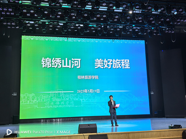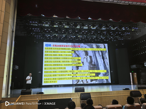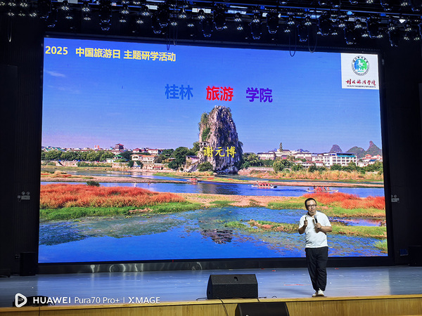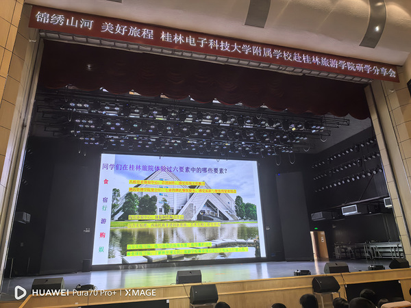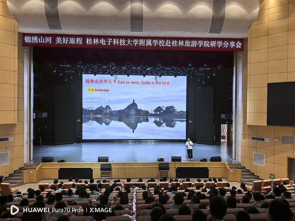 活动最后,是一场关于桂林旅游的专题讲座,为同学们打开了历史与文化交融的大门。主讲谢老师以徐霞客游记为脉络,讲述他当年游历桂林时对漓江山水、阳朔风光的描绘,以及桂林独特地貌对古代文人墨客的吸引力。East or west,Guilin is the best.通过这一场分享,我们再一次为桂林山水风光及深厚历史底蕴而感到震撼,增强了作为桂林人的自豪感与文化自信。通过对比古今桂林旅游的发展变化,同学们也深刻认识到了旅游资源保护与开发的重要性,同时,旅游演艺学院带来三场精彩舞蹈演出:独具风情的瑶族舞蹈、舞武融合的双人舞蹈,以及独舞《天宫》。演员们以灵动舞姿,完美诠释艺术魅力,将活动推向高潮