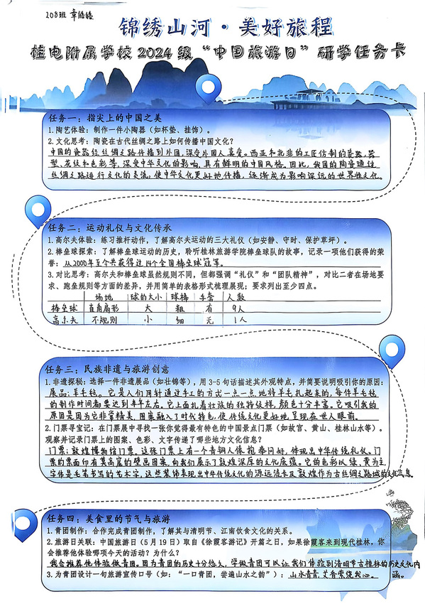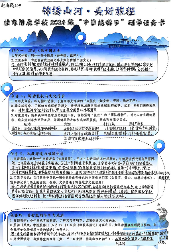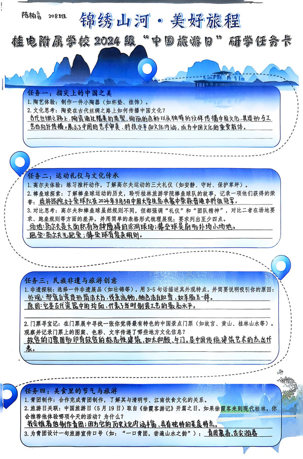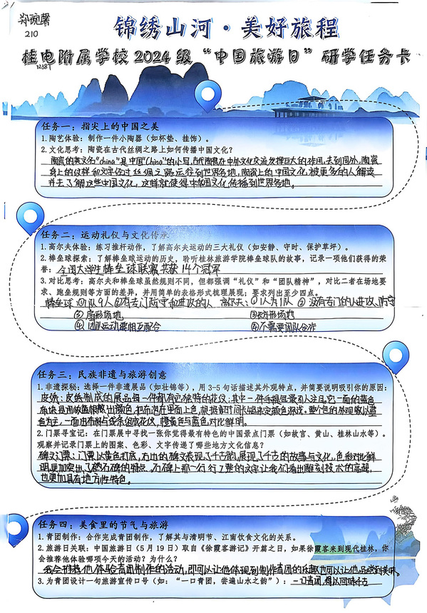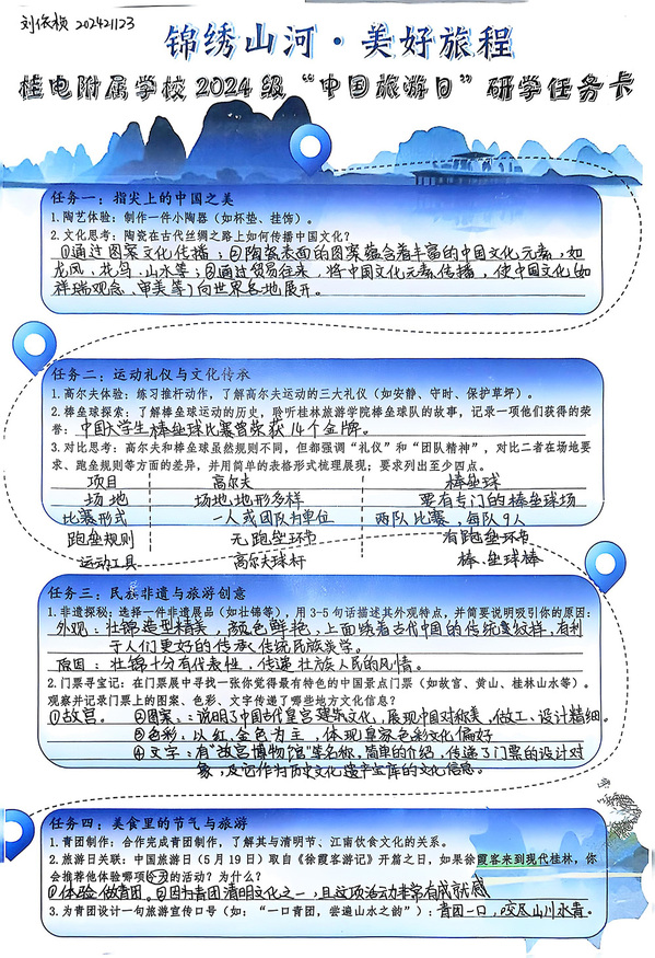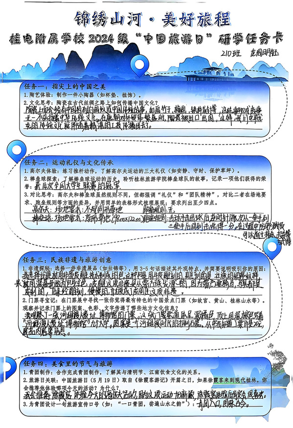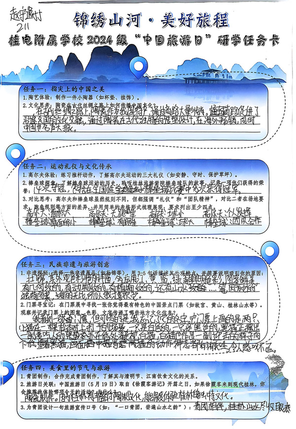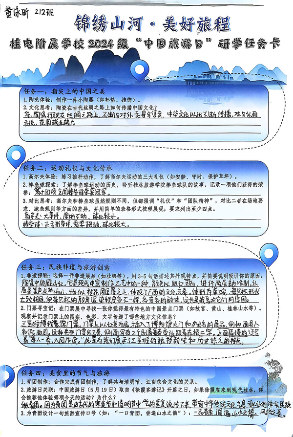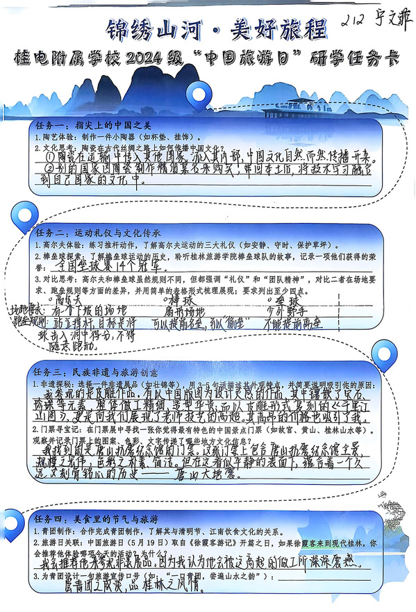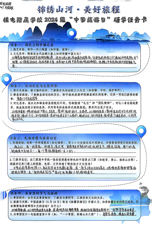 此次桂林旅游学院研学活动,初一学子们以山水为纸,以脚步为笔,丈量自然与历史,在多元体验中不仅拓展了视野,加深了对旅游文化的理解,还在实践中提升了综合素养。同学们纷纷表示,这是一次难忘的研学之旅,也期待未来能将所学所感运用到生活中,为旅游文化的传承与发展贡献自己的力量。
