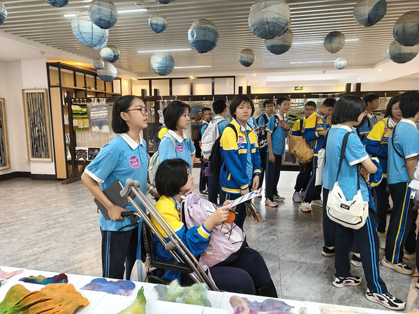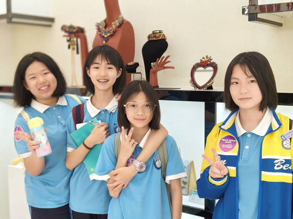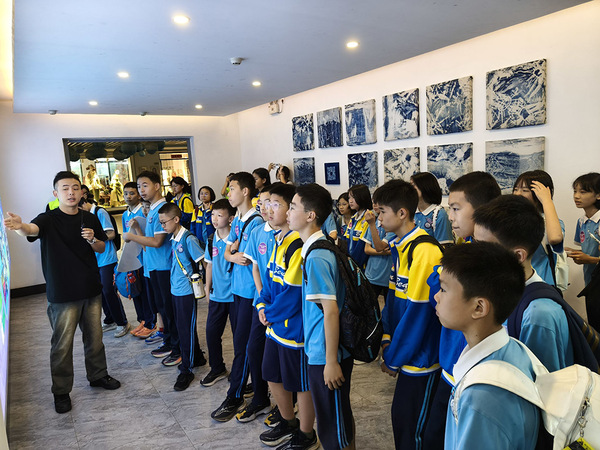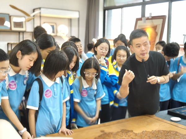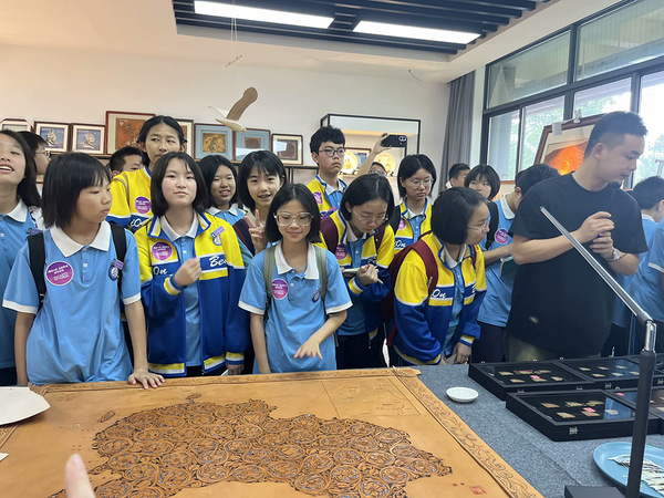 活动伊始,同学们踏入非遗创新展品展厅,眼前的展品令人眼前一亮。皮雕技艺被赋予现代几何图案,将雍容华贵的珠宝与中国版图设计巧妙结合,贝雕流光溢彩,引人入胜,创新展品不仅保留了非遗技艺的精髓,还紧跟时代潮流,符合现代人的审美,革故鼎新,与时俱进。同学们穿梭其中,认真观察每一件展品的细节,纷纷感慨匠人制作工艺的高超,体悟中华文化之美。