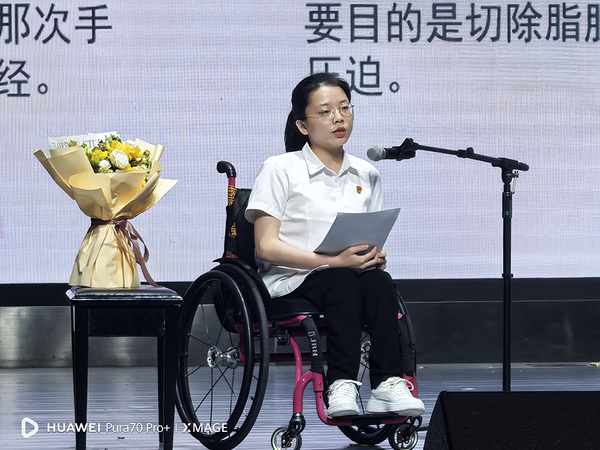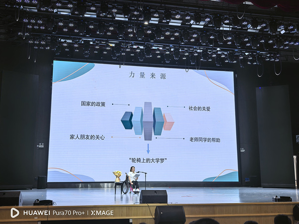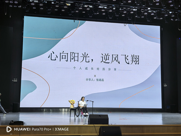 “在黑暗中掘地洞之余,要努力化眼泪为知识。”在活动即将迎来尾声的时候,一位勇敢的追梦人用自己的成长历程深深感动着在场的每一位师生。张靖函学姐虽家境贫寒,甚至因病被“禁锢”在轮椅上,但她最终凭借自己的努力考入大学,并且已经考取研究生。成长路上心向阳光,逆风飞翔,这样的人生态度将激励在场学子不断坚持、不断拼搏,成就不凡人生。