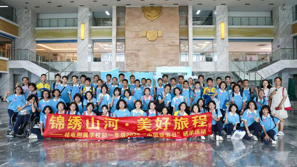 5月19日,值此"中国旅游日"来临之际,桂林电子科技大学附属学校2024级师生走进桂林旅游学院,开启了一场融合文化传承、体育体验与历史探索的研学之旅,同学们在实践中感受旅游文化的独特魅力,在互动中领略专业院校的办学特色。本次活动在桂林旅游学院工会田静主席的统筹协调下,得到了桂林旅游学院工会、团委、艺术设计学院、户外运动学院、食品与健康学院、酒店管理学院等多个部门的大力支持与通力配合。