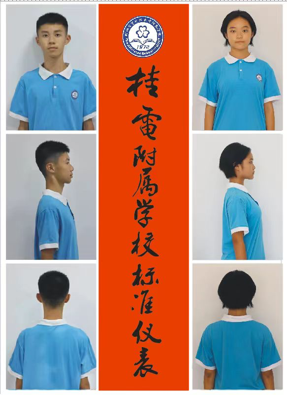 男生一律留平头或小寸头(要求“三不盖”——前不盖额头,侧不盖耳朵,后不盖衣领;无鬓发、无尾发、无刘海);女生一律要求不搭衣领短发(或齐耳短发)、不过眉短刘海或无刘海;男女均不允许佩戴任何首饰。
