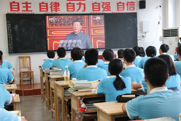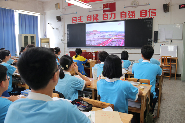 上午9点,桂电中学、桂电附属学校教师们分别集中在三教、六教报告厅观看阅兵仪式直播,学生们在各自的班级里观看。全校师生认真聆听中共中央总书记、国家主席、中央军委主席习近平的重要讲话,共同见证这一场展现国家繁荣昌盛和军队不断发展壮大的盛世荣光。