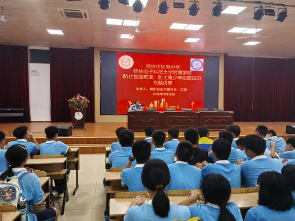 为筑牢校园安全防线,促进学生身心健康发展,营造和谐的校园氛围,9月28日晚,桂电中学、桂电附属学校在学校礼堂举行了“向校园欺凌说‘不’”预防校园欺凌专题教育活动。本次活动特邀桂林市七星分局朝阳派出所江涛副所长进行讲座。