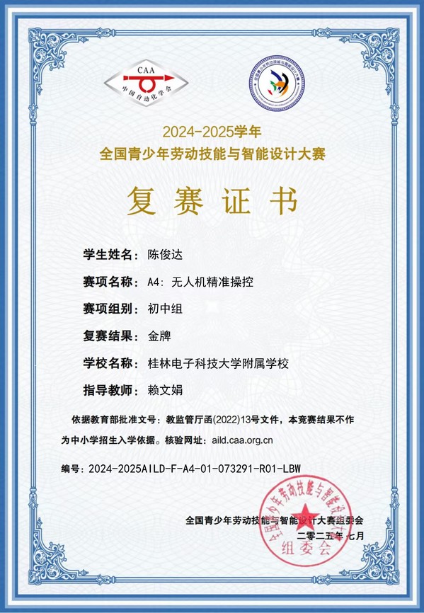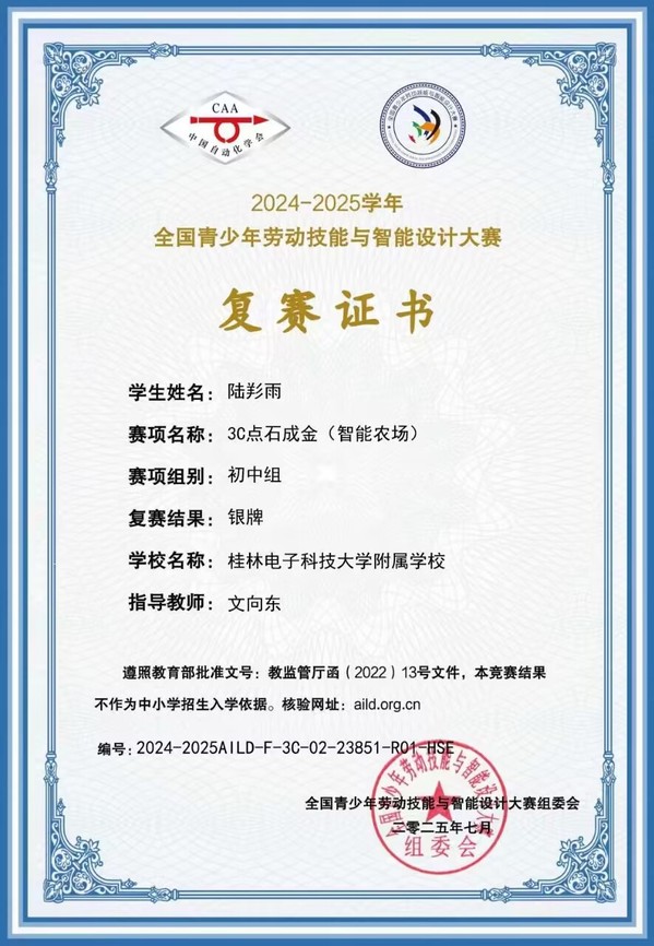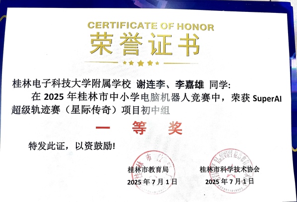 209班谢连李、209班李嘉雄在2025年桂林市中小学电脑机器人竞赛中,荣获Super AI超级轨迹赛(星际传奇)项目初中组一等奖,展现了优秀的综合素质与积极的精神风貌。