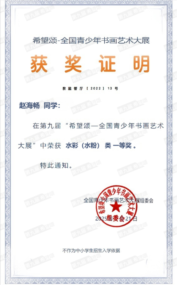 在文化艺术领域,学子们用画笔描绘梦想,用作品传递美感。在第九届“希望颂——全国青少年书画艺术大展”中,209班赵海畅和209班赵海然两位同学凭借出色的水彩(水粉)创作能力,双双荣获水彩(水粉)类一等奖。
