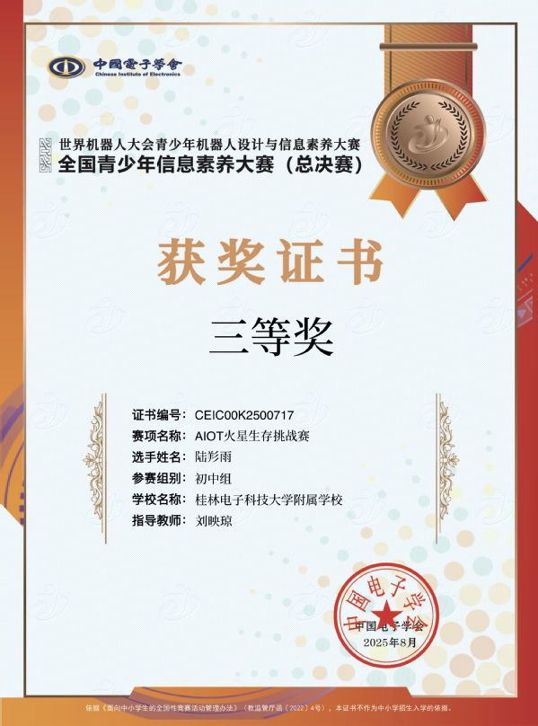 212班陈俊达、212班陆羏雨分别在全国青少年劳动技能与智能设计大赛中荣获初中组金牌、银牌。212班陆羏雨同时还收获世界机器人大会青少年机器人设计与信息素养大赛全国青少年信息素养大赛(总决赛)AIOT火星生存挑战赛三等奖。