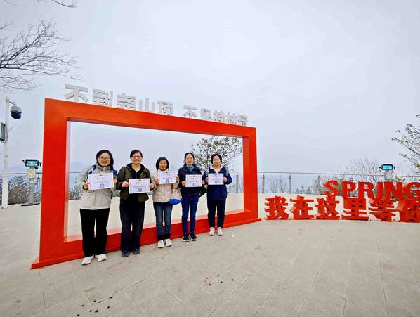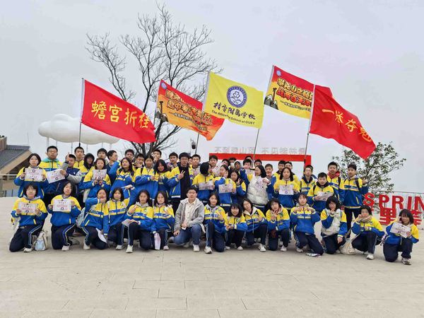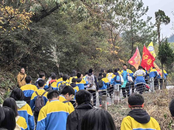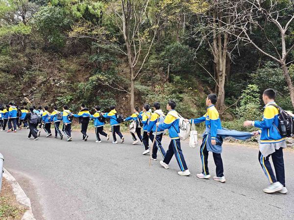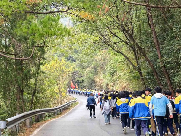 登山途中,翠意盎然,红叶交辉,正是 “绿水青山就是金山银山” 理念的生动写照。面对蜿蜒陡峭的路段,学子们不慌不忙、相互提携,前方同学伸手牵引,后方同学鼓劲加油,大家以坚韧的毅力克服山路险阻,历经近两小时的徒步跋涉,全体学子成功登顶。站在山巅极目远眺,桂林城全貌尽收眼底,鳞次栉比的建筑与蜿蜒的漓江相映成趣,山河壮阔的景致让同学们豪情满怀,更坚定了冲刺中考的信念。