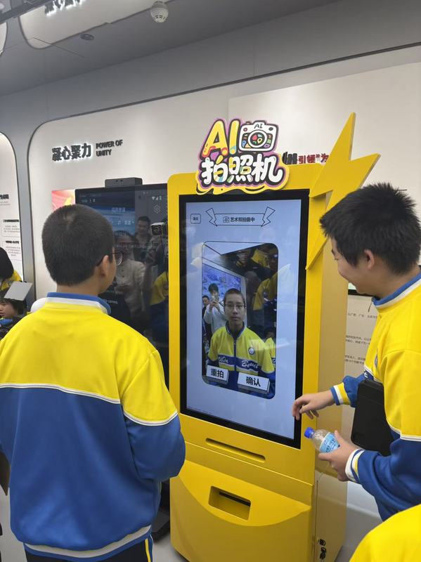 活动尾声,AI拍照机前排起了长队。同学们笑着拍下瞬间,选定心仪的创意样式,仅需 30 秒,一张设计精美、充满个性的照片便新鲜打印出炉。捧着专属的AI创意照片,大家脸上的笑容格外灿烂,为第一站研学画上了圆满句号。