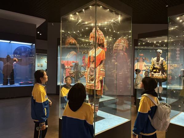 下午,同学们来到了广西民族博物馆,一进博物馆,目光便被一件件承载历史记忆的展品深深吸引。古朴厚重的铜鼓镌刻先民智慧,绚丽多彩的民族服饰绣满独特民俗符号,精巧绝伦的银饰、织绣及竹木器,让大家直观领略到广西少数民族文化的厚重底蕴。同时也让同学们联想到上午接触到的人工智能技术,或许能成为文化传承的“新翅膀”——通过数字建模让文物 “活起来”,借助AI复原让传统技艺“传下去”,利用智能传播让民族文化 “走出去”。科技赋能文化传承,传统滋养创新灵感,这场双向奔赴的体验,不仅深化了同学们对广西多彩民族文化的认知,更让中华民族共同体意识在心中悄然扎根、愈发牢固。