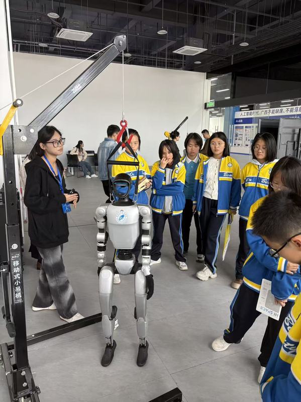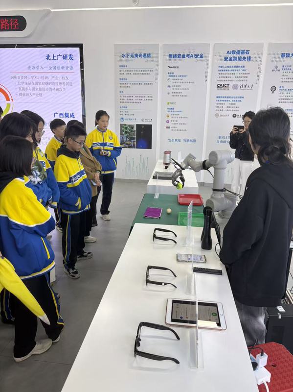 如果说润建展厅让同学们读懂了 AI 的应用,广西人工智能学院则让大家直观感受到了科技的“硬核实力”。这里堪称“黑科技集合地”:会模仿做健身动作的人形机器人、能精准抓取物品的机械臂、能身临其境模拟各类场景的 VR 设备,每一样都让同学们目不暇接,忍不住凑近观察、小声惊叹。讲解员用通俗有趣的语言,把专业的产业术语变成了易懂的科技故事,还拆解了人工智能在各类行业中的应用,使人工智能不仅能优化手机算法,还能让城市变得更“聪明”,让生活变得更便捷。