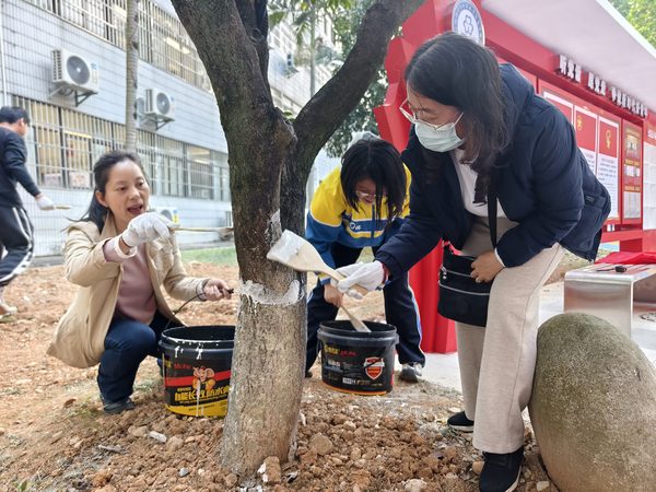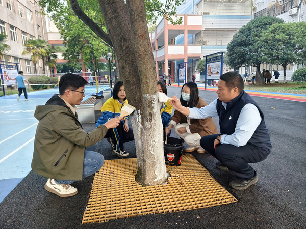 活动中,党员教师们率先示范,讲解涂白防虫、防冻的科学作用及操作要领。团员们在老师指导下,分工协作,挥洒汗水,师生们化身“护绿使者”,细心为树干穿上“防护衣”。整个劳动过程井然有序,一棵棵树木在师生们的手中披上了整齐的“白铠甲”,成为校园里一道独特的风景线。