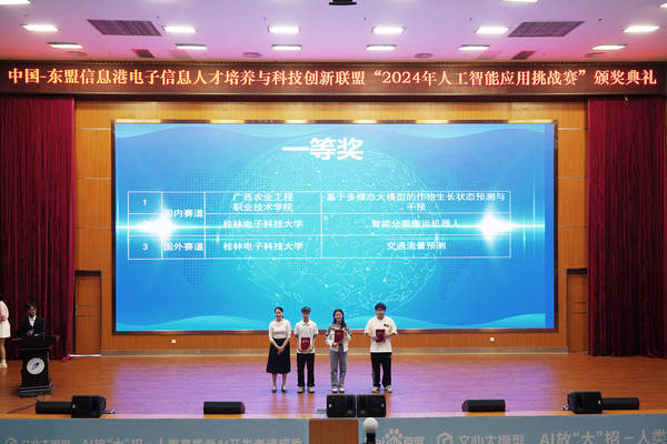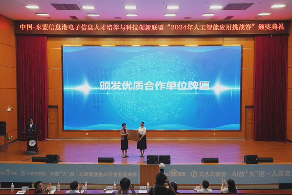 9月26日,中国-东盟信息港电子信息人才培养与科技创新联盟“2024年人工智能应用挑战赛”颁奖典礼在我校花江校区图书馆报告厅举行,校党委副书记聂慧,百度高校合作部负责人,校团委、人工智能学院相关领导,获奖师生代表和其他学生代表近400人参加。