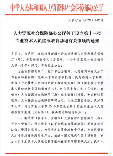 近日,国家人力资源和社会保障部办公厅印发《关于设立第十三批专业技术人员继续教育基地有关事项的通知》(人社厅函〔2024〕142号),我校成功获批“国家级专业技术人员继续教育基地”。