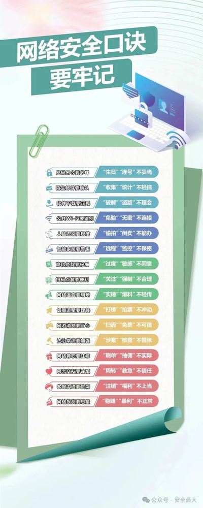 2024年是习近平总书记提出网络强国战略目标10周年,是习近平总书记提出总体国家安全观10周年,也是习近平总书记作出网络安全工作“四个坚持”重要指示5周年。今年的国家网络安全宣传周主题是“网络安全为人民,网络安全靠人民”。大家在享受如今互联网,带来便利的同时也要时刻注意互联网背后存在的巨大隐患电信诈骗、信息泄露网络谣言、恶意软件......以下这份“网络安全知识”手册,大家要牢记!