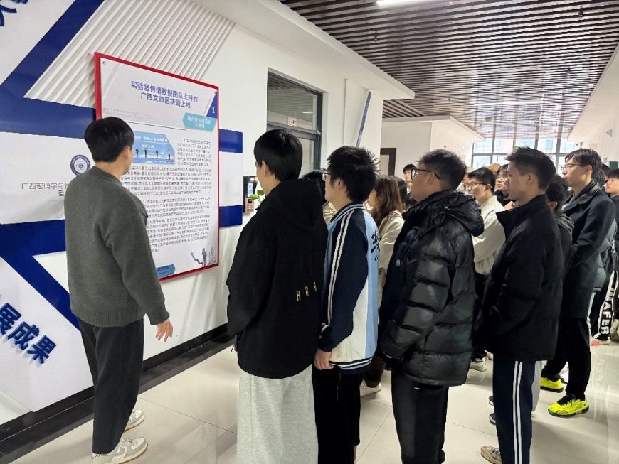 参观人员在韦永壮教授及其研究生的带领下,分多个批次参观实验室成果、展板以及相关的密码设备。韦永壮教授及实验室工作人员耐心细致地为同学们讲解了不同研究团队的成员以及研究方向,并就学生们的提问进行解答。
