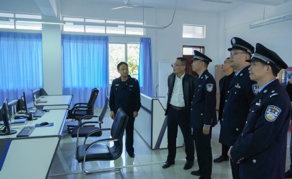 揭牌仪式后,赖声虎警官一行参观了桂电北海银滩校区监控室,了解校区安防设施情况。