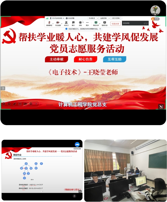 为进一步促进优良学风建设,3月5日-8日,计算机工程学院开展2023-2024学年春季学期学业帮扶活动。本次活动采取分年级、分课程、线上线下相结合等多种方式,由党员教师和优秀学生党员共同为有补考课程的同学梳理课程重点难点、讲解习题,传授学习方法,切实为同学们的学业发展提供助力。