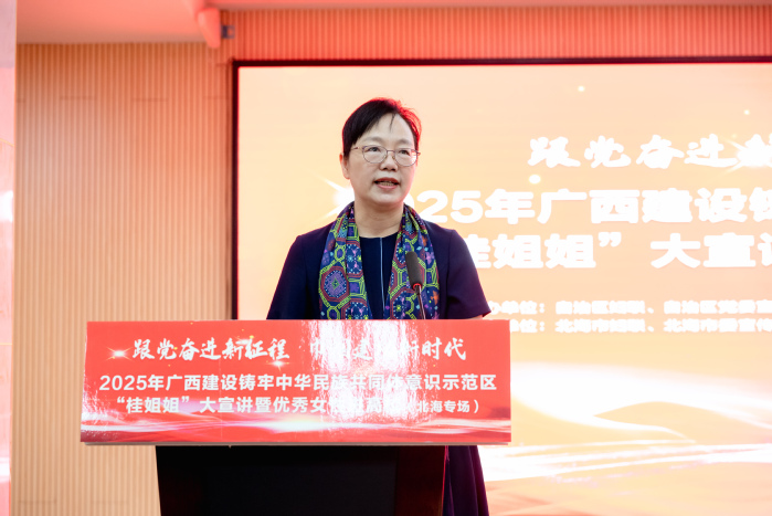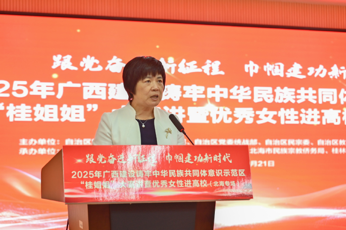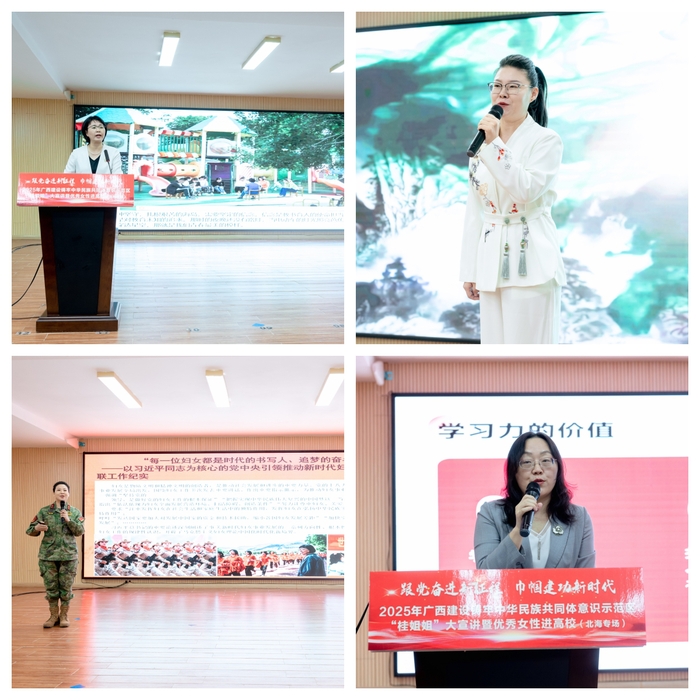 10月21日,2025年广西建设铸牢中华民族共同体意识示范区“桂姐姐”大宣讲暨优秀女性进高校北海专场活动在北海校区报告厅举行。活动由广西壮族自治区妇联等五部门主办,北海校区、北海市妇联等部门承办。市妇联党组书记、主席、市二级巡视员池樱,北海校区党委书记秦竟芝、党委副书记曹计划,市有关单位领导及校区三百多名学生代表参加活动。