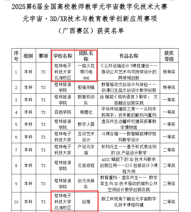 近日,第六届全国高校教师教学元宇宙数字化技术创新大赛(广西赛区)在桂林举行,设计与创意学院公共艺术专业“一路火花带闪电666”教师团队荣获本科组特等奖,工业设计“创维”教师团队荣获本科组二等奖。其中,“一路火花带闪电666”教师团队晋级国赛。