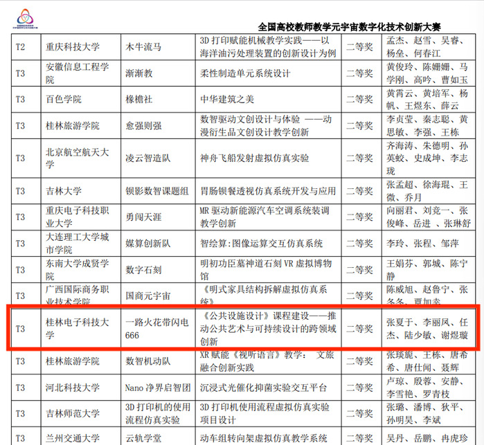 11月20日,2025第6届全国高校教师教学元宇宙数字化技术创新大赛全国总决赛榜单揭晓,设计与创意学院“一路火花带闪电666”教师团队(团队成员:张夏于 李丽凤 任杰 陆少敏 谢煜璇)荣获全国总决赛二等奖。