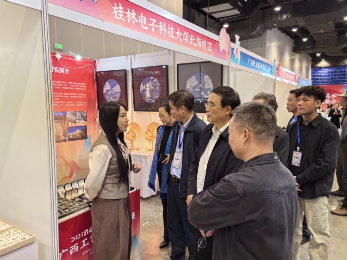 11月22日至24日,2025广西工艺美术精品展在南宁举办,设计与创意学院陈承洁、陈杰等师生代表的优秀作品应邀参展。自治区工业和信息化厅二级巡视员杨富刚、轻工处处长曾祥平亲临校区展位指导,对师生作品的设计理念与工艺水平给予高度评价。