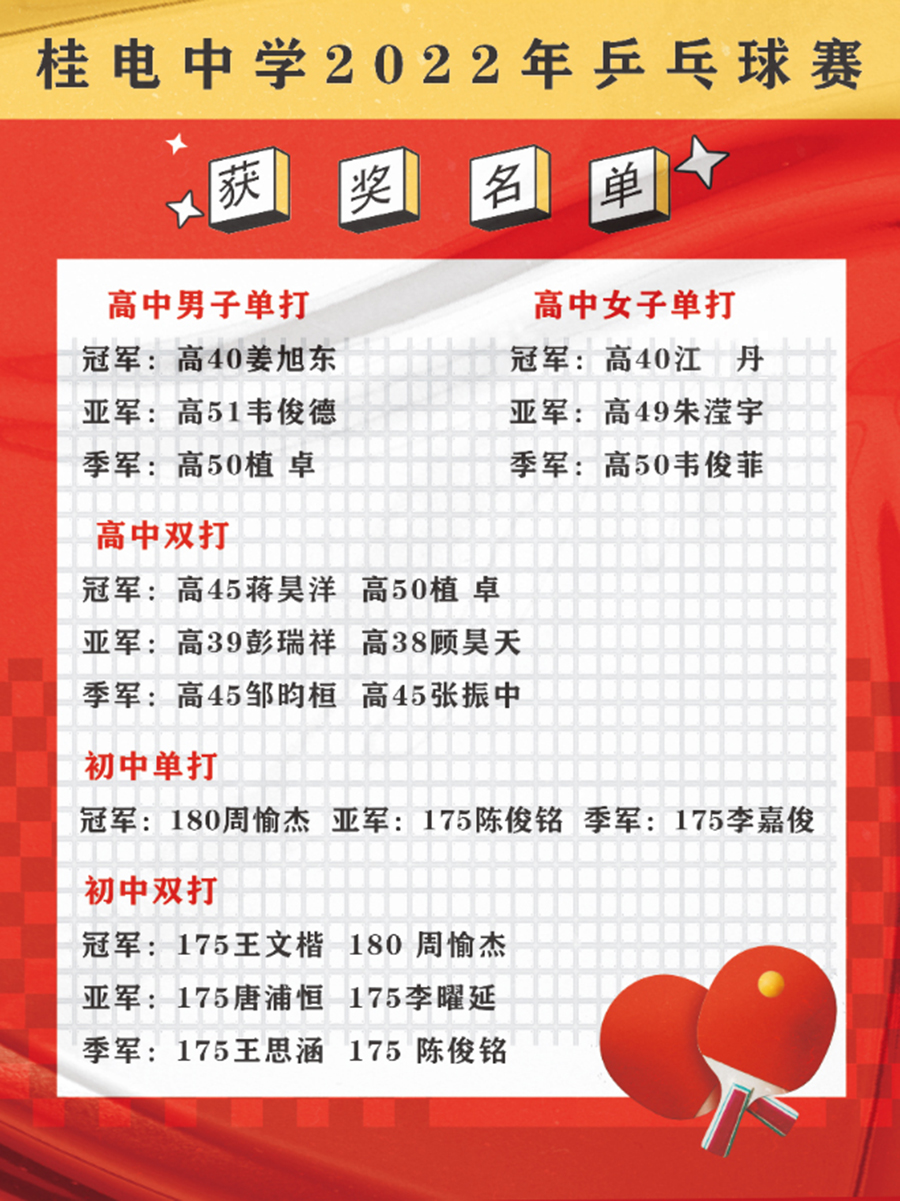 经过一个多星期的紧张比拼,我校2022年乒乓球赛终于落下帷幕,此次比赛是由我校团委学生会主办,初一初二高一高二学生参加。 单人赛中,选手们发挥自身优势,满怀激情,勇往直前;团体赛中,他们相互配合,取长补短,干劲十足。赛场上的他们尽情地挥洒着汗水,以“胜不骄,败不馁”的心态赛出了运动的魅力,展现了桂电学子的青春活力。 在紧张的学习之余,此次乒乓球比赛,放松了同学们的身心,提高了大家的运动积极性,丰富了校园文化,也是对“更高、更快、更强、更团结”的奥运精神的传承与弘扬。 在此次比赛中,许多同学积极参与,奋力拼搏,拿下了傲人的成绩,赛出了水平,赛出了风格。以下为获奖名单: 图文:团委学生会 初审:盘媛媛 终审:翟光嘉