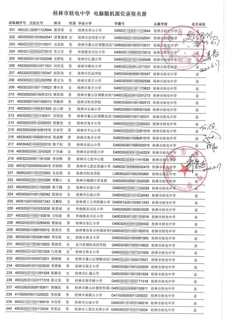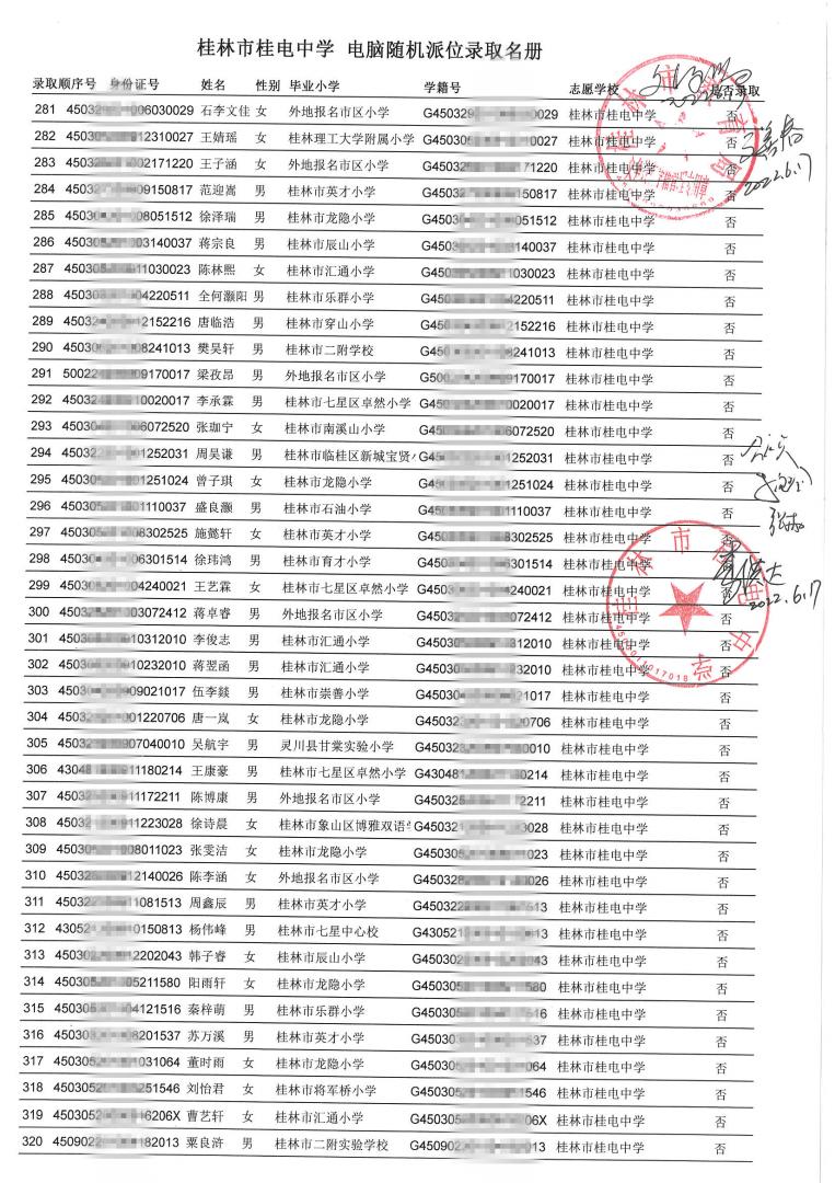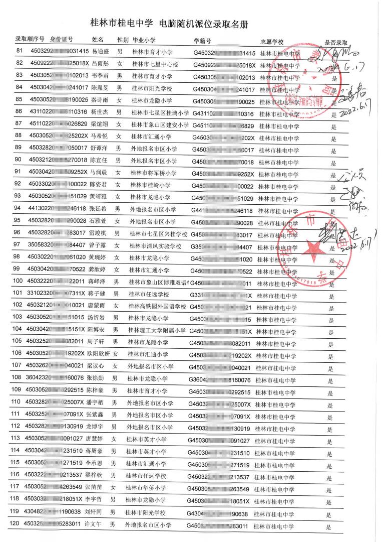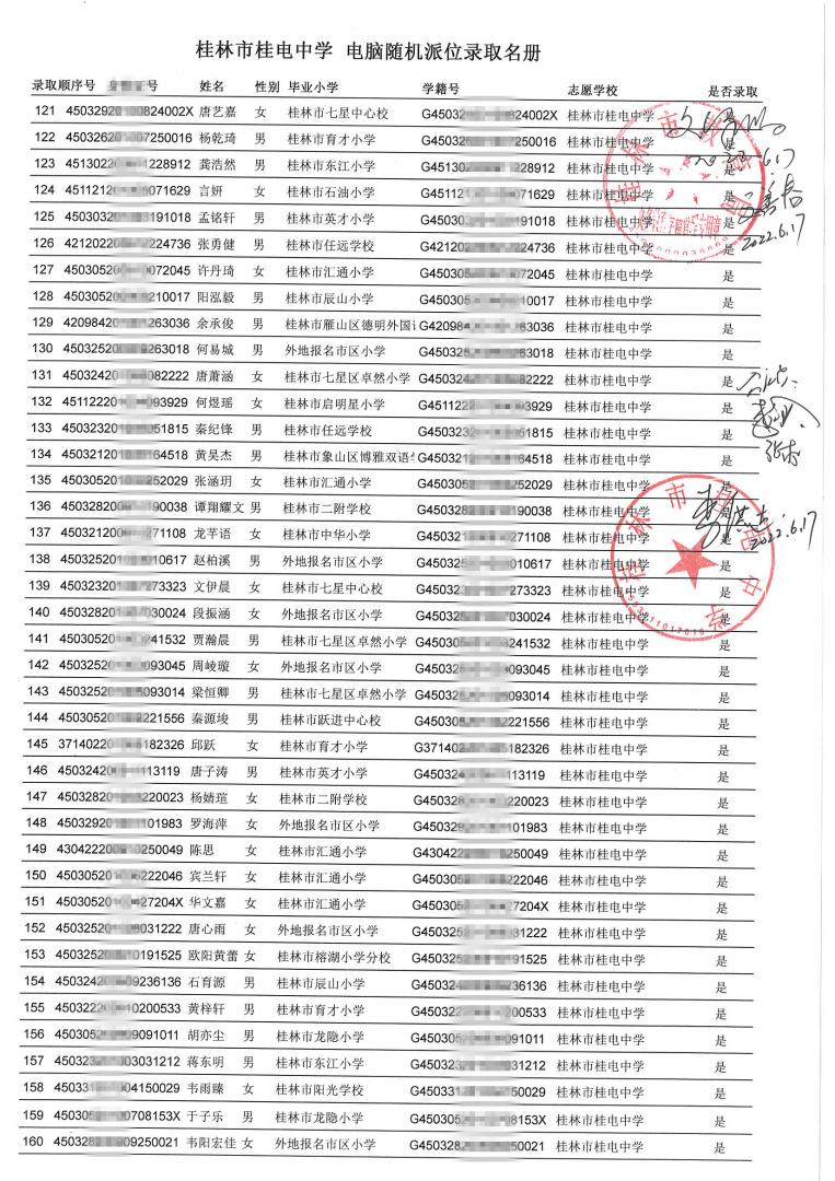 桂林市桂电中学 电脑随机派位录取名册