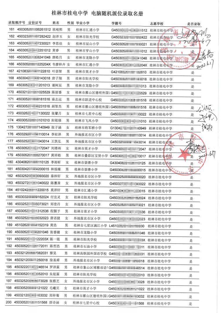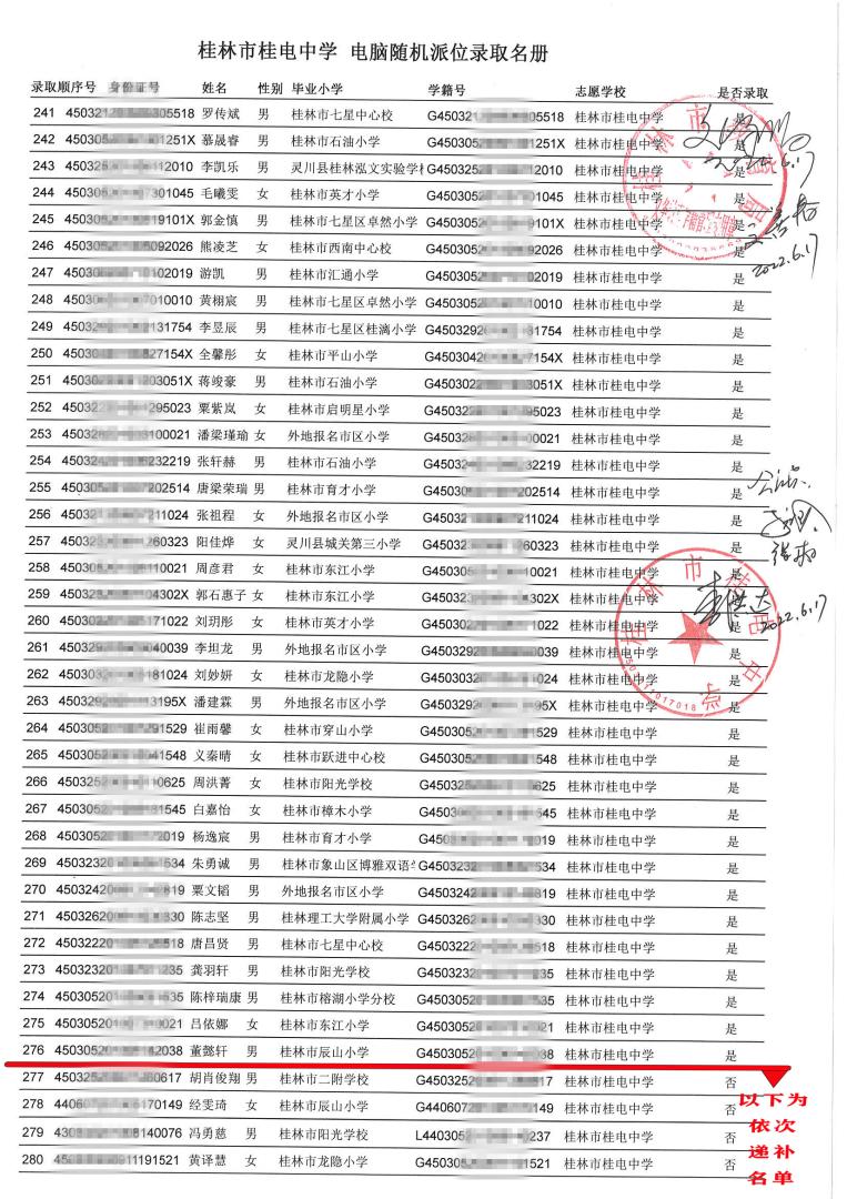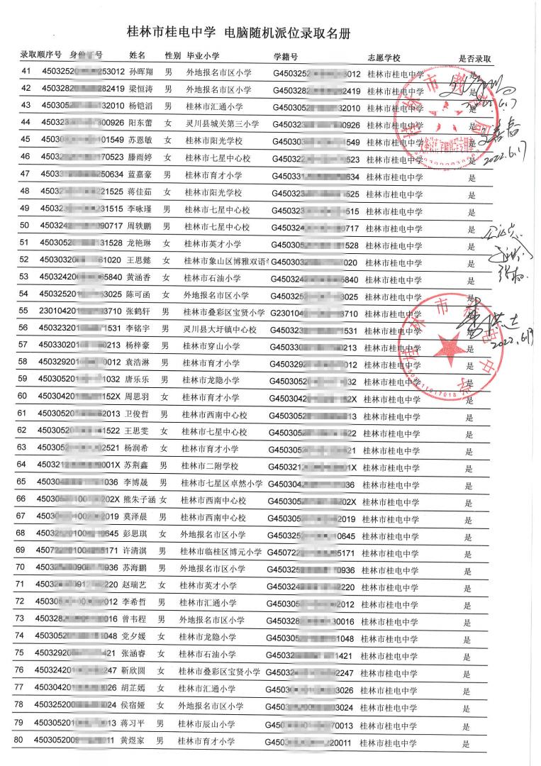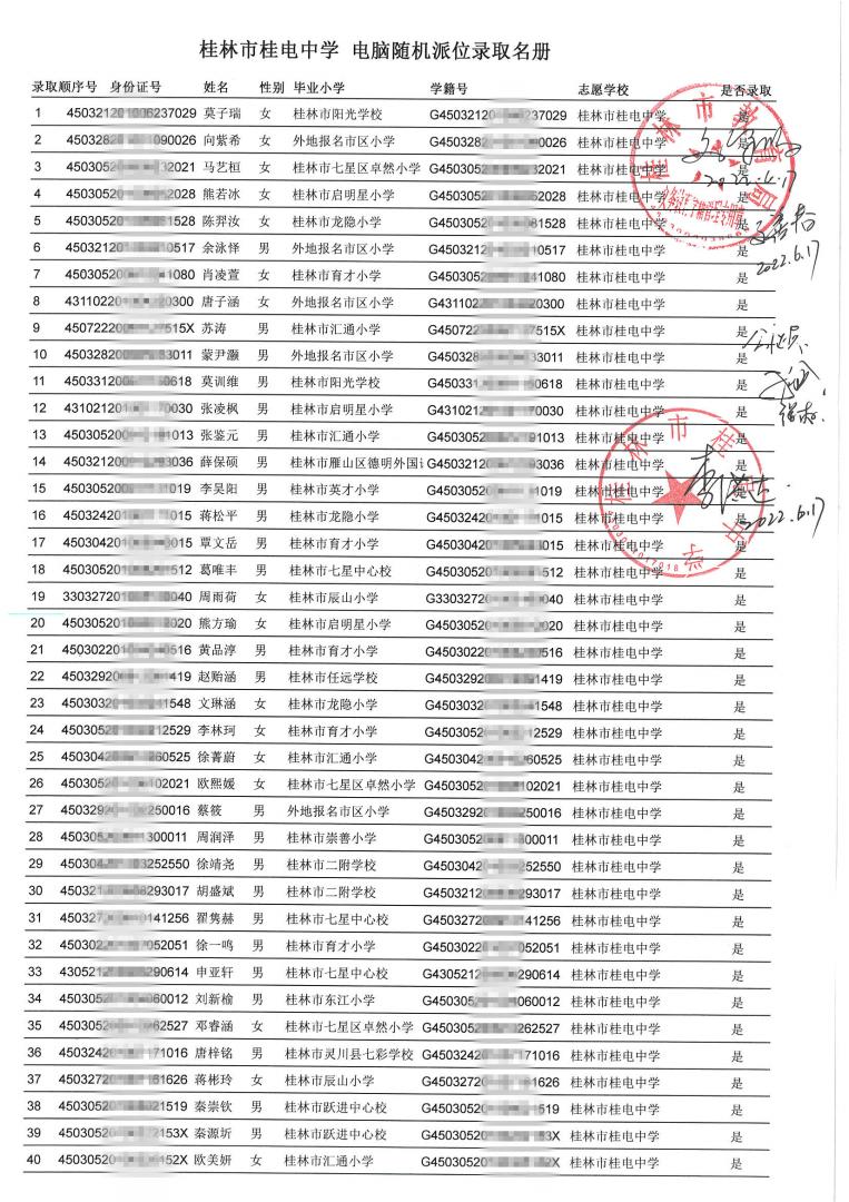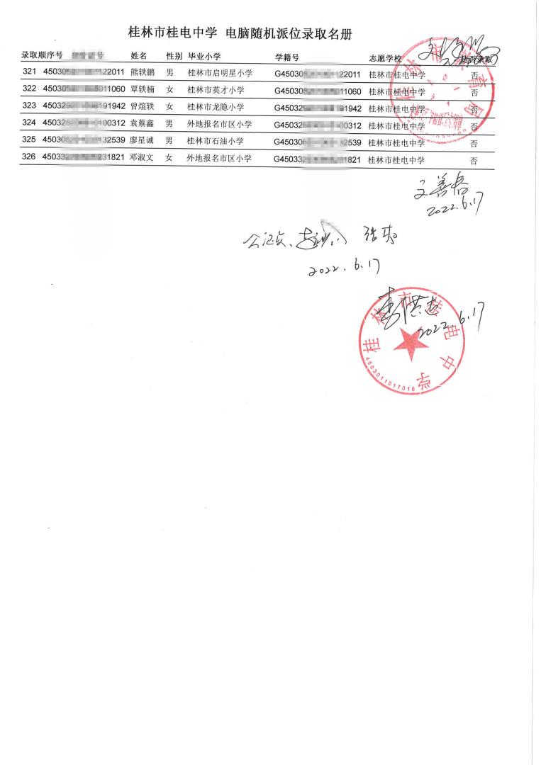 桂林市桂电中学 电脑随机派位录取名册