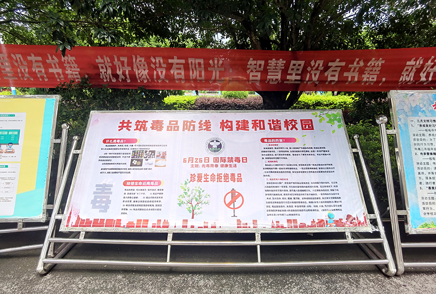 6月26日是第35个“国际禁毒日”,为进一步科普禁毒知识,提高我校师生禁毒意识,营造浓厚禁毒宣传氛围。近日,我校开展了一系列禁毒宣传教育活动。 首先,升旗仪式上,团委学生会文化设计部部长杨丁一和社会实践部部长周宇航发表题为《禁毒让生活更美好》的演讲。他们向大家讲述青少年拒绝毒品的方法,一、成为禁毒知识小达人,对于毒品的危害要有清醒的认识;二、当好家庭守卫者,从自己做起,不让毒品进家庭,劝导身边亲友远离毒品;三、当好禁毒宣传员,积极参与“无毒社区”、“无毒校园”的创建活动。他们还郑重呼吁同学们:让我们积极行动起来,从现在开始,珍爱生命,拒绝毒品,让生命之花绚丽绽放! 其次,我校组织召开禁毒主题班会,全校师生参与。班会课上大家集体观看禁毒教育宣传片,视频向同学们讲解了毒品的种类、毒品的危害以及青少年该如何防范毒品等多方面的禁毒知识,让同学们深刻意识到毒品的迷惑性、隐蔽性和危害性。 除此之外,6月27日下午第九节课,我校团委学生会在乒乓球台组织开展禁毒宣传活动,本次活动采取现场宣讲和横幅签名的形式,学生会工作人员向同学们科普禁毒知识,并鼓励大家在横幅上签名,一起参与到禁毒宣传,人人争做禁毒小卫士。 最后,为了巩固禁毒宣传工作的成效,我校还制作了禁毒宣传展板,放在同学们必经的道路旁。展板主要内容为:什么是毒品、毒品的种类、毒品对于青少年的危害等,认真贯彻习近平总书记关于禁毒工作系列重要指示精神,紧紧围绕自治区教育厅关于禁毒宣传的要求,扎实做好校园禁毒宣传工作。 通过开展一系列禁毒宣传教育活动,切实有效地提高了我校师生对于毒品知识的了解程度,提升了大家的禁毒意识,有助于我校进一步筑牢毒品防线,构建和谐健康的绿色无毒校园环境。 图文:盘媛媛、团委学生会 审核:翟光嘉