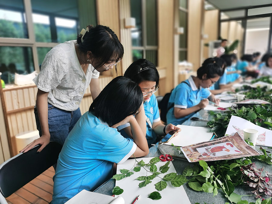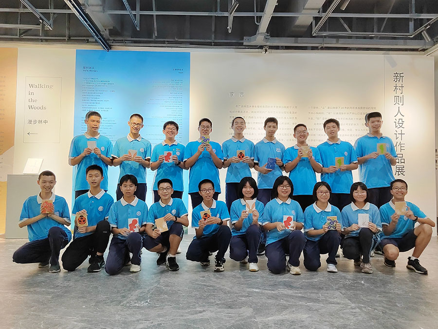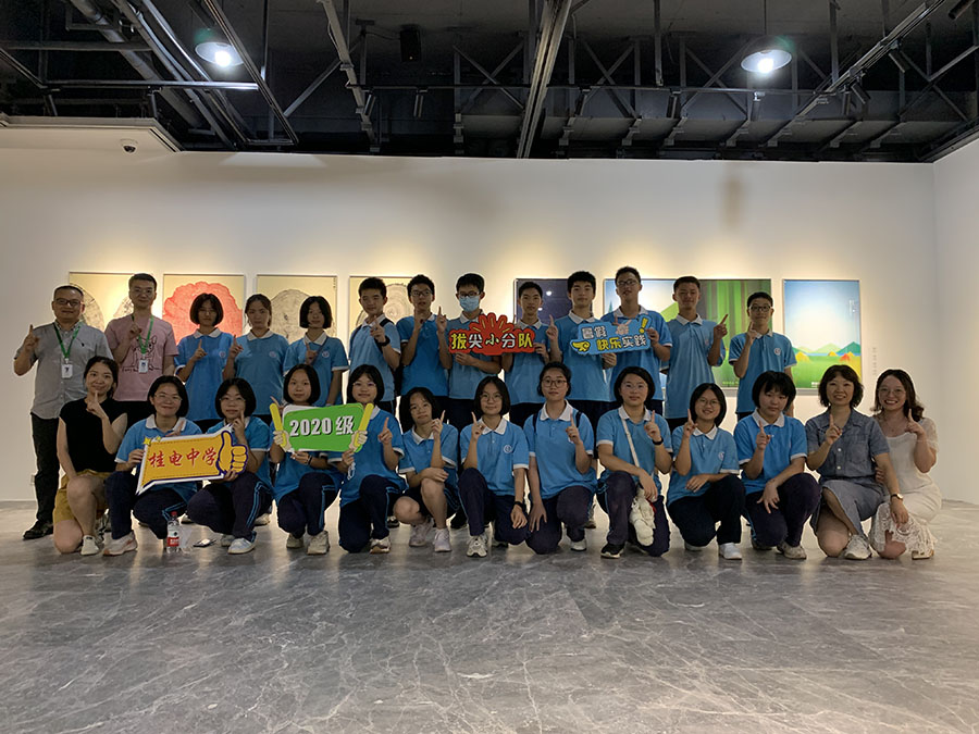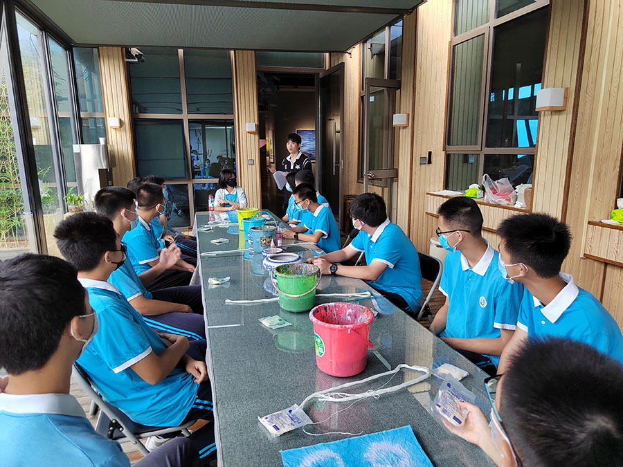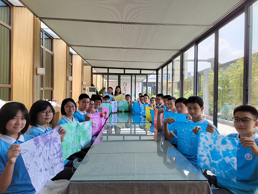 色彩的碰撞、深浅不一的视觉观感、简单的线条勾勒、寓意深刻的设计,走进广西师大出版社美术馆,仿佛步入艺术的殿堂。7月13、14日,我校初二年级拔尖小分队走进广西师大出版社美术馆参观新村则人设计作品展,并参加了不同的体验项目,踏上美好假期生活。 新村则人为国际知名平面设计师,作品多次获得日本及国际多项设计大奖。此次展览分为“漫步林中”“穿越大海”“城市生活”三个部分,这些作品简洁而质朴,在真实展现大自然魅力的同时,也体现了新村先生源自自然、追求人与自然和谐共生的设计理念,带领学生走进充满奇趣的大自然,体验生活中被人们忽视的美好。此外,此次展览也是新村先生几十年设计生涯的缩影,透过展览学生也可体会其设计理念、风格、手法的变化历程,感悟艺术的魅力。 一号拔尖小分队参与了叶片创意拼图的体验活动。活动中,同学们充分开动头脑,让智慧与审美碰撞,让创意与灵感激发,通过剪刻﹑拼接﹑粘贴﹑点染等方式,创作出一幅幅奇思妙想的精美作品,用自己的双手和智慧留住树叶的绚烂。此项活动开拓了同学们的思维与想象,提升了对自然美的欣赏能力,从而让同学们更加热爱生活、热爱自然。 二号拔尖小分队参与了扎染的体验项目。扎染,是非遗文化里浓墨重彩的一笔。它是通过纱、线、绳等工具,对织物进行扎、缝、缚、缀、夹等多种形式组合后进行染色,扎染工艺分为扎结和染色两部分。学生按照老师的指导和自己的构思,将方巾折出不同的形状。通过图案设计定位、折叠、扭曲等工艺造型,并用棉线进行固定绑扎。活动现场大家不停地互相交流、互相欣赏,感受着即将成功的喜悦。经过浸泡、上色后,一条条鲜艳夺目、明彩靓丽犹如万花筒般瑰丽图案的手工特色方巾呈现在大家眼前。看到自己亲手制作完成的扎染方巾变成了一件件工艺品,大家发出了阵阵惊叹和欢呼声并纷纷展示自己的作品。此次扎染活动不仅让同学们开阔眼界、培养创意思维、锻炼艺术实践能力,也让他们感受到了中国传统手工扎染工艺的魅力。