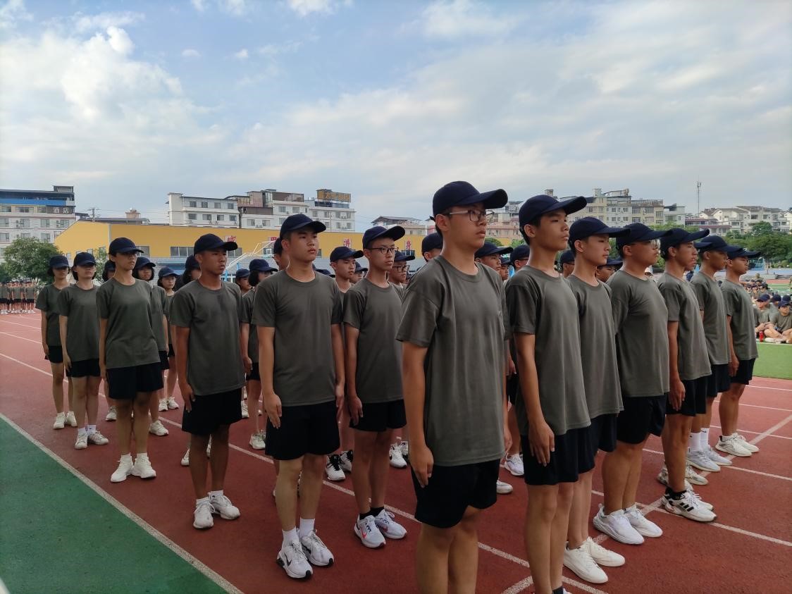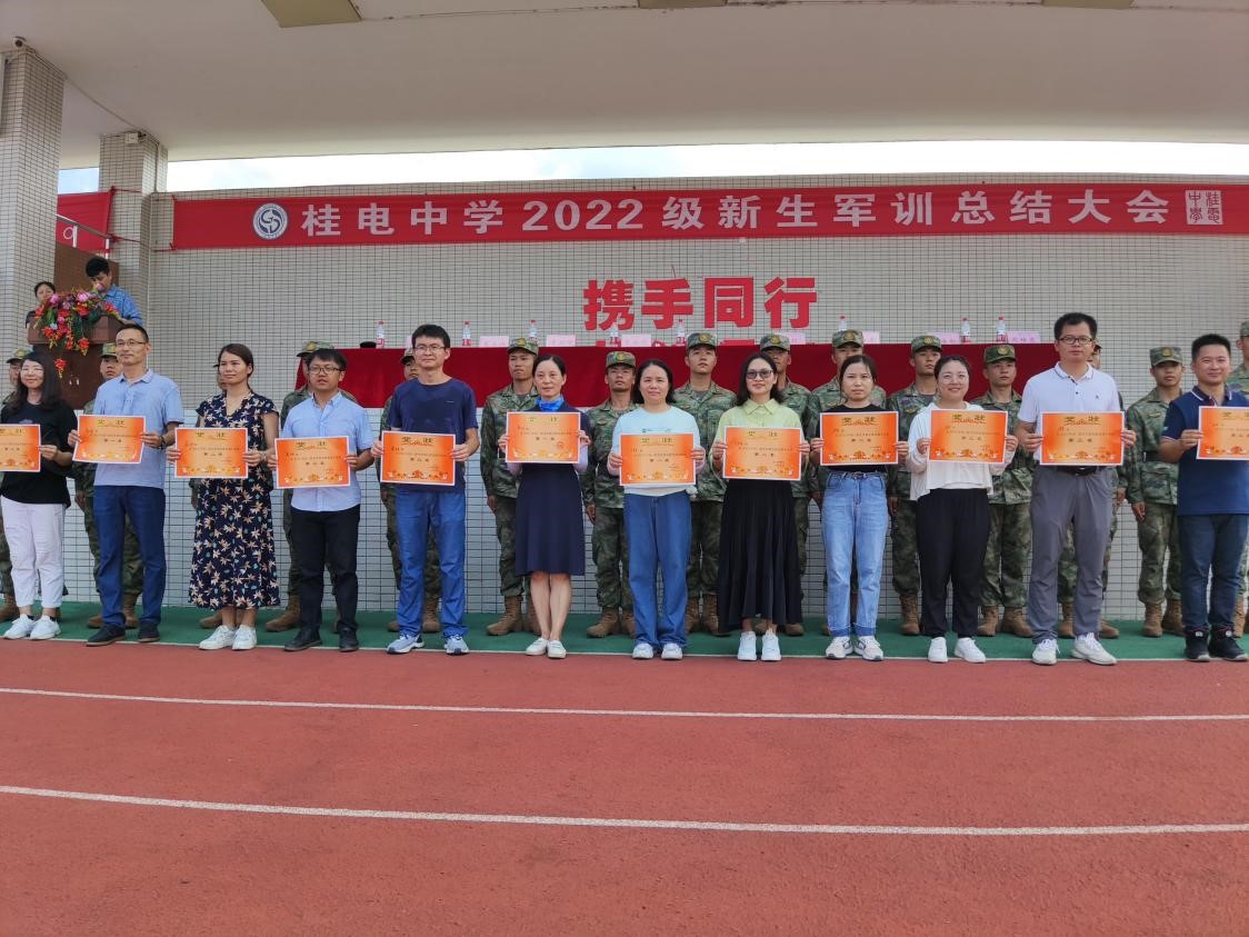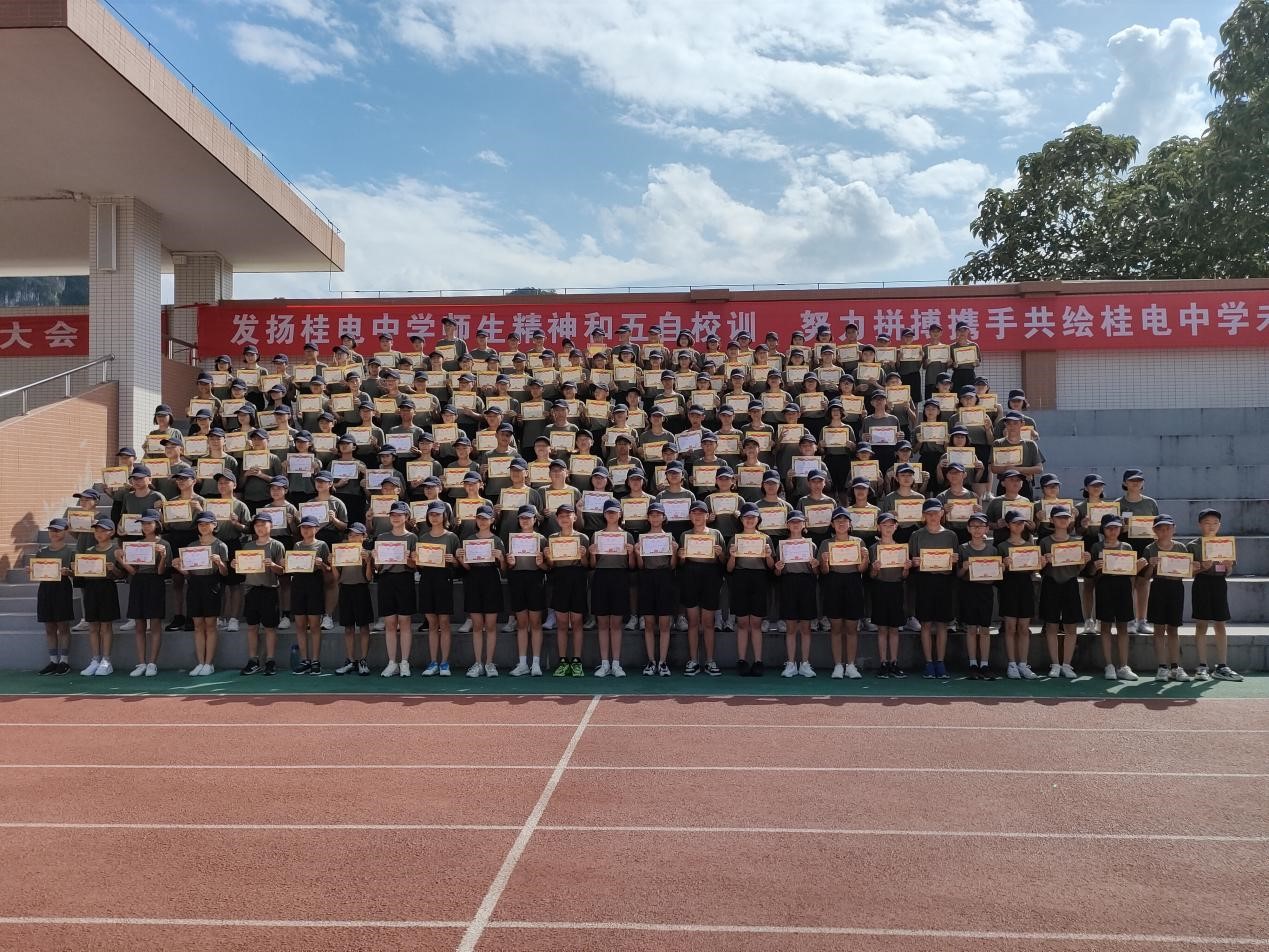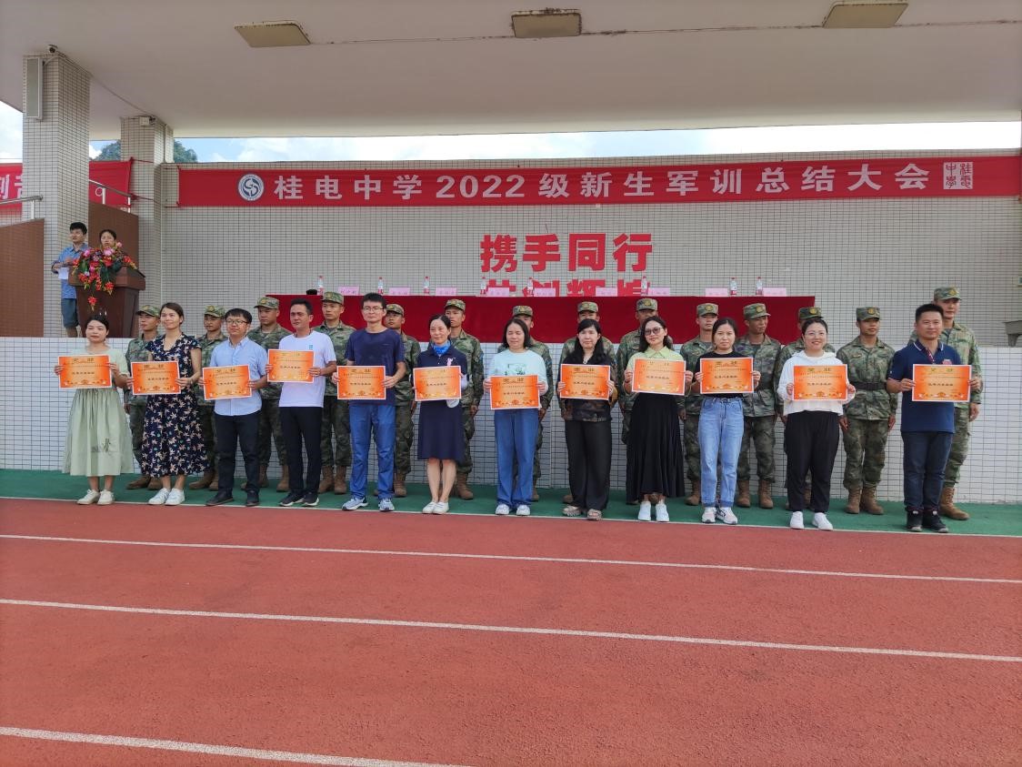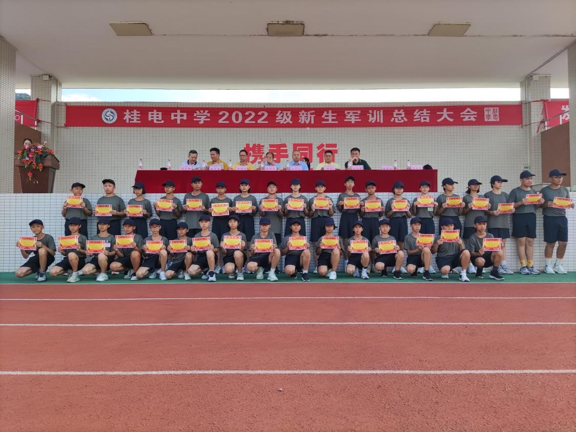 军乐声声,汗水书写青春,烈日炎炎,磨练见证成长。8月20日上午,我校2022级新生军训总结大会在操场隆重举行,整齐划一的会操,气势恢宏的口号。全体学生精神抖擞,用饱满的热情汇报军训成果,用昂扬的气势吹响奋进的号角。 校长彭剑波、党委书记杨剑等校领导出席大会并观看表演。承训教官、学校相关职能部门、各年级负责人及2022级全体新生参加大会。 大会伊始,庄严的国歌响起,全体起立向国旗行注目礼,全场气氛严肃而庄严。 国旗班升国旗 “2022级军训会操表演开始!”一声令下会操正式开始。22个军训方阵迈着整齐划一的步伐,喊着嘹亮的口号从主席台依次走过。整齐的脚步,沉着自信的精神面貌,响彻云霄的口号。他们所表现出的昂扬气势,无一不彰显着军人热情刚毅,追求卓越的血性。 接下来,政教处对在军训中表现突出的个人和集体进行表彰。 优秀内务班级名单: 高52 高53 高54 高55 高59 高60 194班 195班 196班 197班 200班 201班 会操获奖班级: 初中 第一名 196班 第二名 195班 194班 第三名 200班 201班 198班 高中 第一名 高52班 高58班 第二名 高57班 高59班 第三名 高53班 高55班 获奖班级合影留念 最后,文向东副校长对此次军训做了总结发言。文副校长说:“同学们在军训中充分展现了自己搏击困难的信心与勇气,也展现了桂电学子良好的精神风貌。军训一阵子,受益一辈子,在今后的学习生活中,希望同学们以此次军训为起点,记住自己的责任与初心,向优秀学长学姐学习,发扬桂电学子精神和五自校训,保持军训中学习到的吃苦耐劳、不怕困难、团结向上的品质,继续创造桂电中学新的辉煌!” 文向东副校长发言 为期7天的军训在响亮的口号声中圆满划下句点。满载着汗水与拼搏的军训记忆将成为新生们学海生涯里精彩又难忘的一页,军训期间学习到的不怕困难奋勇向前的精神,将指引我们勇敢迎接挑战,不断突破自我,走向更好的未来。