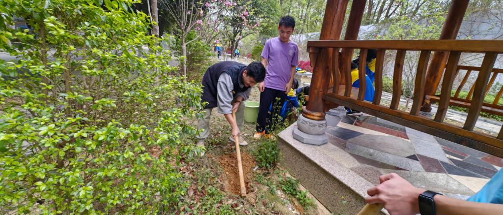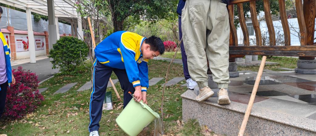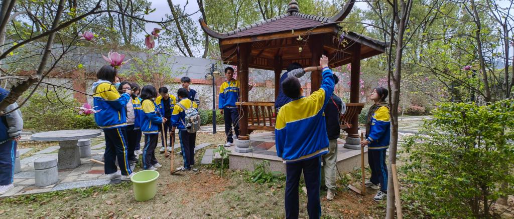 我校一直重视校园绿化建设,在校园生活区域和教学楼周边设立了大片景色宜人的花草绿化带,建有“春”“夏”“秋”“冬”四亭。当日下午第八节课,我校学生会干部在“知冬亭”集合,在周助理的带领下,亲手在四个亭子周边各种了一株紫藤花。从挖坑到固苗,从填土到浇水,每一个步骤都由学生们自己完成,花藤绕柱而上,直攀高檐,忙趁春光,含苞待放,成为校园里新的美景。