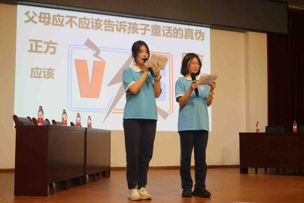 初中的同学们也不甘示弱,引用我们熟悉的童话故事,围绕“父母应不应该告诉孩子童话的真伪”发表各种观点,以口舌作剑,以逻辑为盾,赢得阵阵掌声。而老师们提出的问题和学生会精心设计的抽奖环节巧妙地穿插在选手们精彩的辩论中。