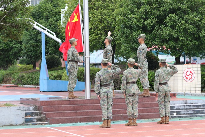 奏唱国歌,鲜艳的五星红旗迎风飞扬,嘹亮的歌声传递出桂电学子深厚的爱国情怀,军训动员大会就此拉开了序幕。