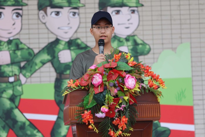 高64班王栩烽同学代表新生发言。他表示:军训不仅仅是为了强身健体,更是为了磨练意志、历练品格。他代表全体参训同学承诺在军训中做到:首先,继承人民军队的光荣传统和优良作风,增强责任感与使命感;其次,一切行动听指挥,不怕苦、不怕累,严格要求自己;再者,认真学习军事技能,增强国防意识,为中华民族的伟大复兴刻苦学习,打下坚实基础。他代表全体参训学生,保证圆满完成本次军训任务,谱写属于桂电中学学子的新篇章!