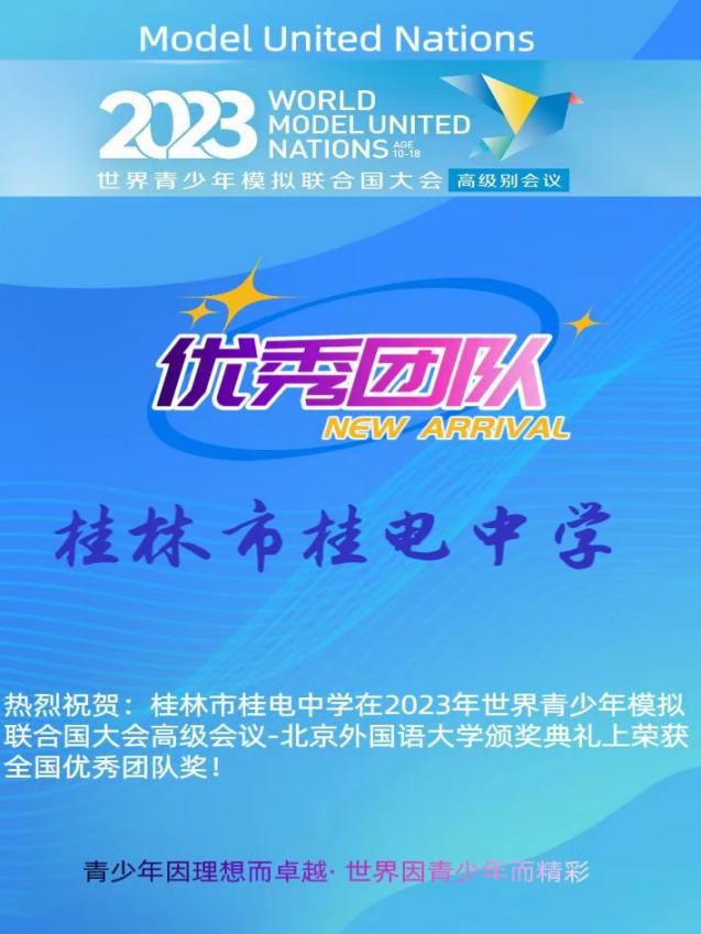 此此次大会,我校荣获全国优秀团队奖,而四位来自桂电中学的指导老师-杨晔老师、李志斌老师、庞小宽老师和吴昌龙老师-一起获得了优秀指导教师的殊荣。 五位同学远赴首都参加世界模联高级会议,不仅是一段值得珍藏的记忆,也是人生旅途里一次重要的经历。通过与全国各地的中学优秀学子同台展示,我们有所获,更有所想。老师和同学们都一同领略了来自世界各地模联人的绝佳风采,立志向更优秀的同伴看齐,取人所长,补己所短。同时,本次大会最遗憾的是材料准备时间不够长、材料广度不够宽,训练时间不够,使我们在大赛过程中偶尔陷入被动状态。但我们相信,虽有遗憾,桂电的学子下次一定会做得更好,更加优秀,期待更多同学加入桂电中学模联队伍,体验模联的魅力。