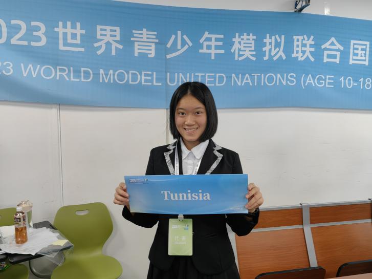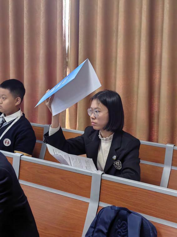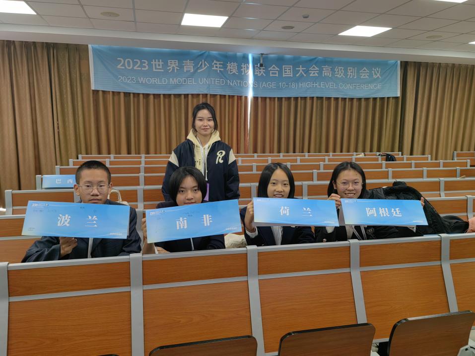 初中中文场的参会同学们体现出责任感、合作意识和创新意识。在完全陌生的环境下,参会的同学们依然能够沉着应对会议上的各种突发状况,抓紧每一次发言机会,为会议的推进提出创新性建设性的建议。初中中文场的参与人员有:188班马昕榕(代表阿根廷)、185班赵芸萱(代表南非)、192班袁梓涵(代表荷兰)和192班韦智宸(代表波兰)。四位同学凭借他们在促进后疫情时代的国际贸易发展议题上的出色表现,获得了好评。在高级会议场上,四位同学不仅锻炼了临场应变能力,而且收获了会场上的友谊。